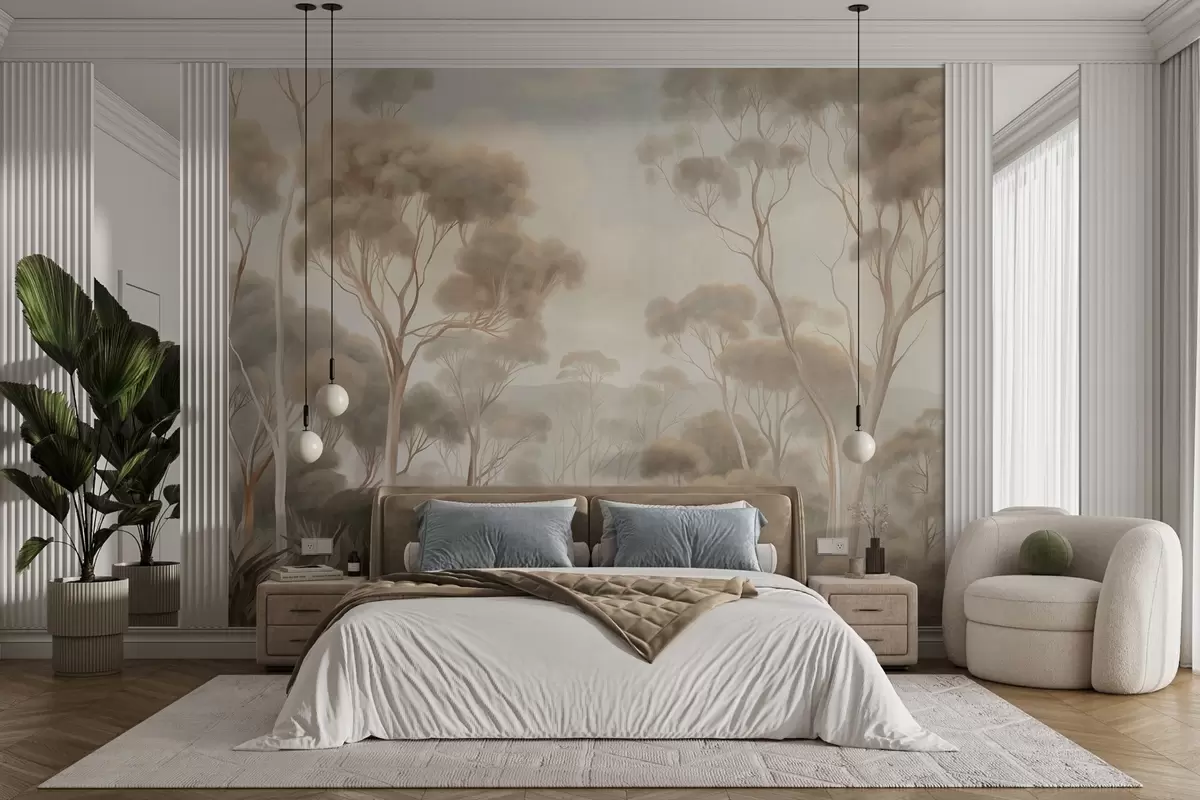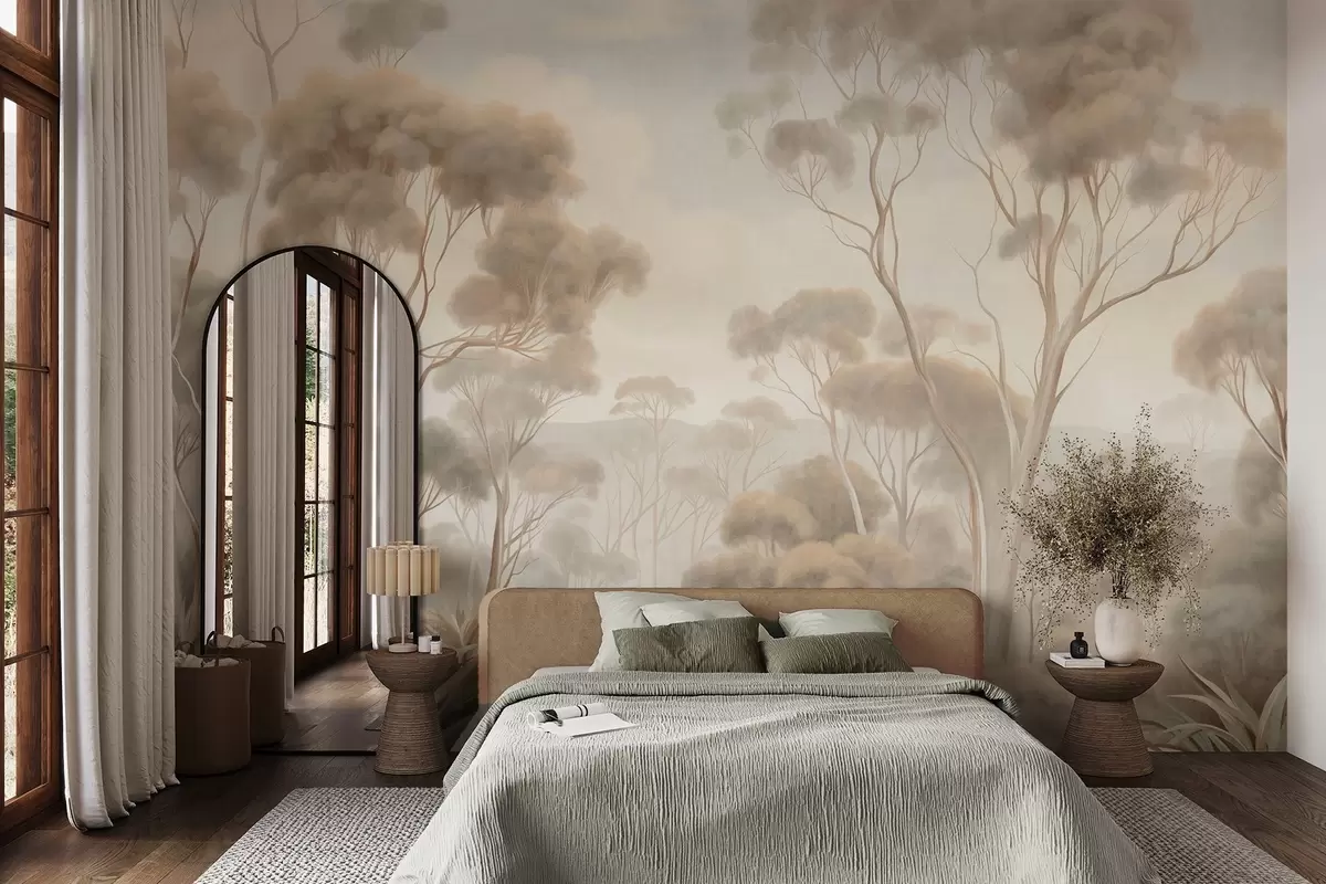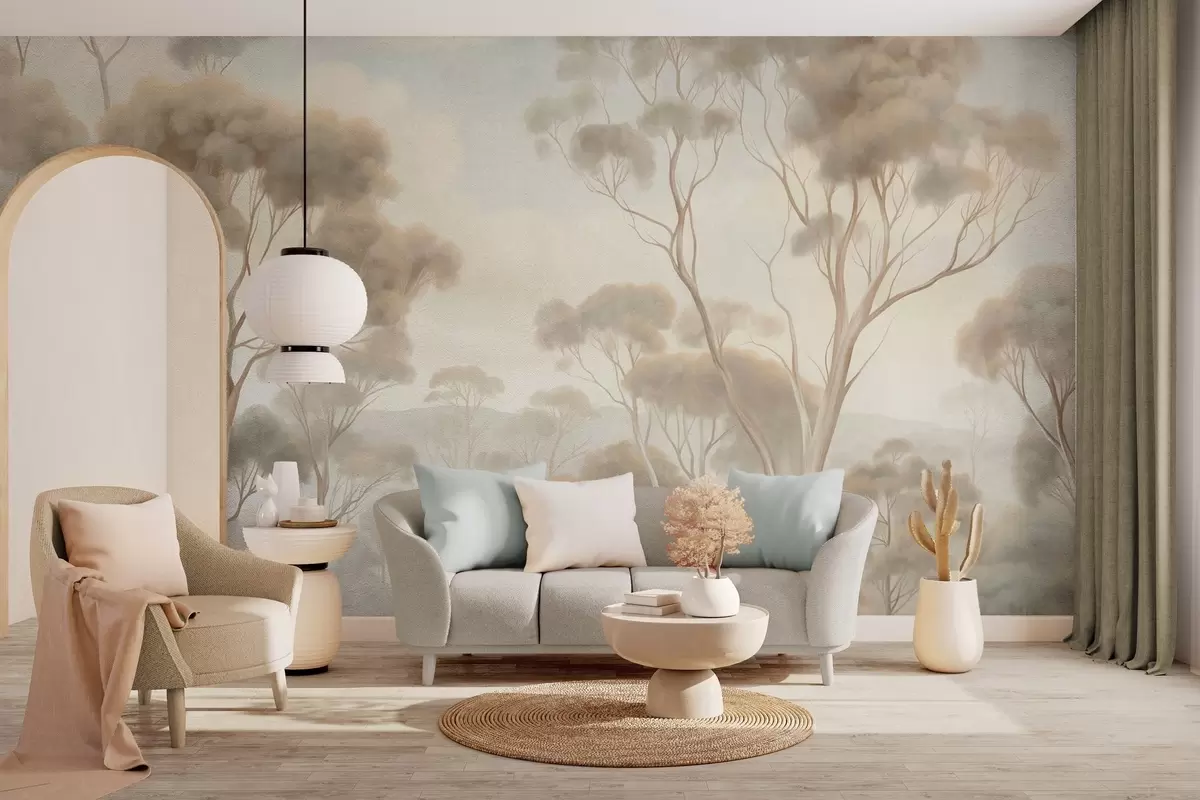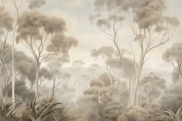 Murais de parede Uma paisagem florestal enevoada com altos eucaliptos, colinas onduladas sob um céu nublado, arte texturizada Nr. w09822