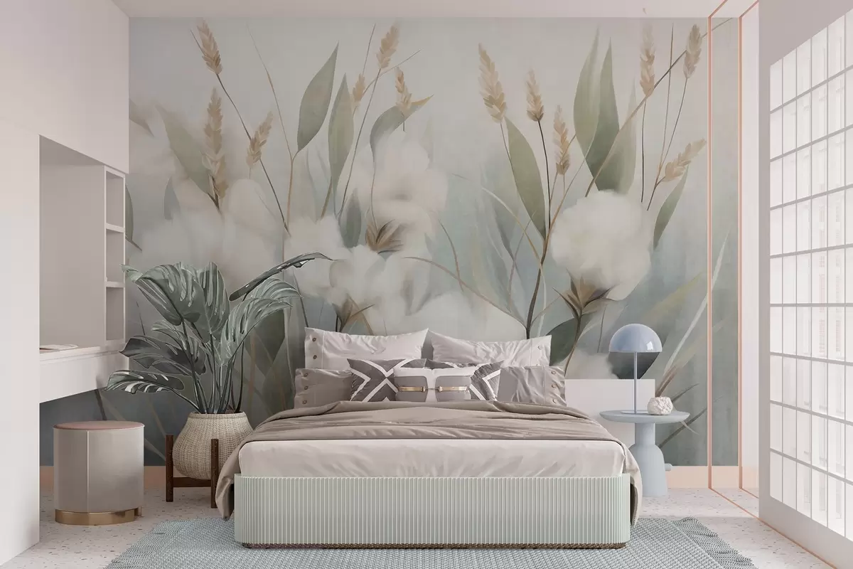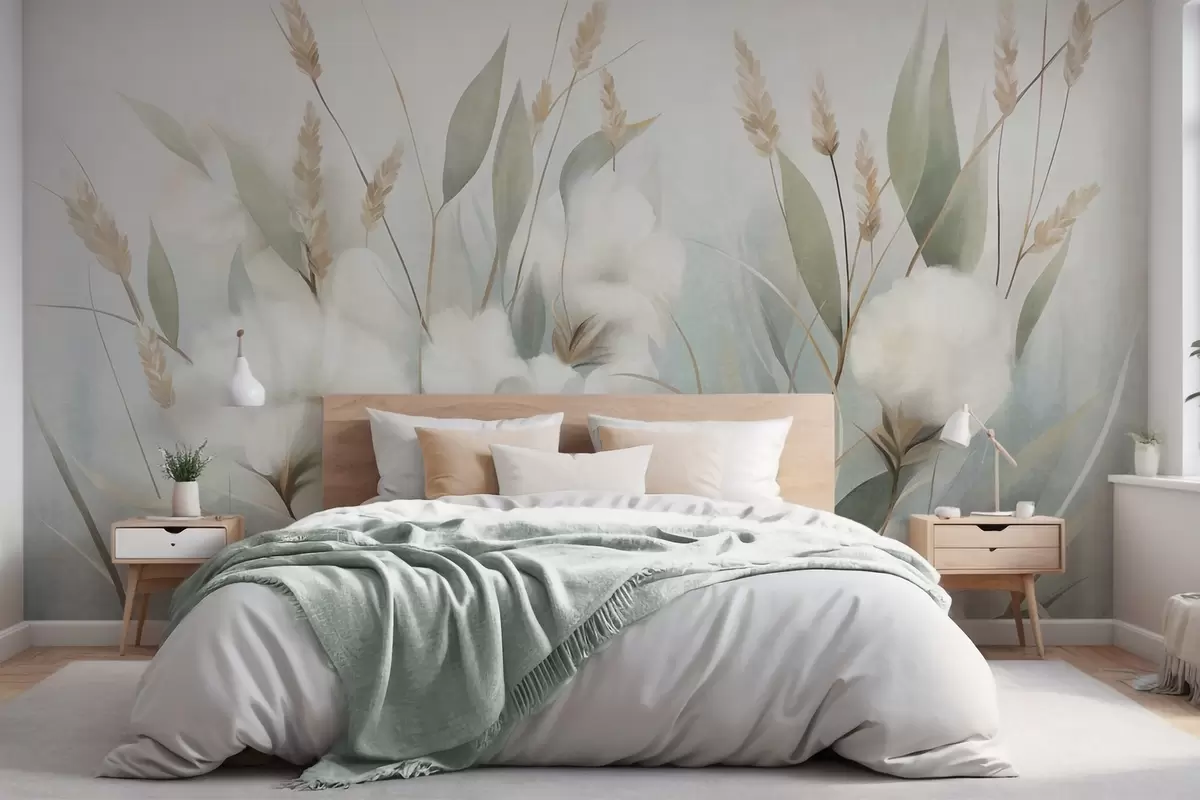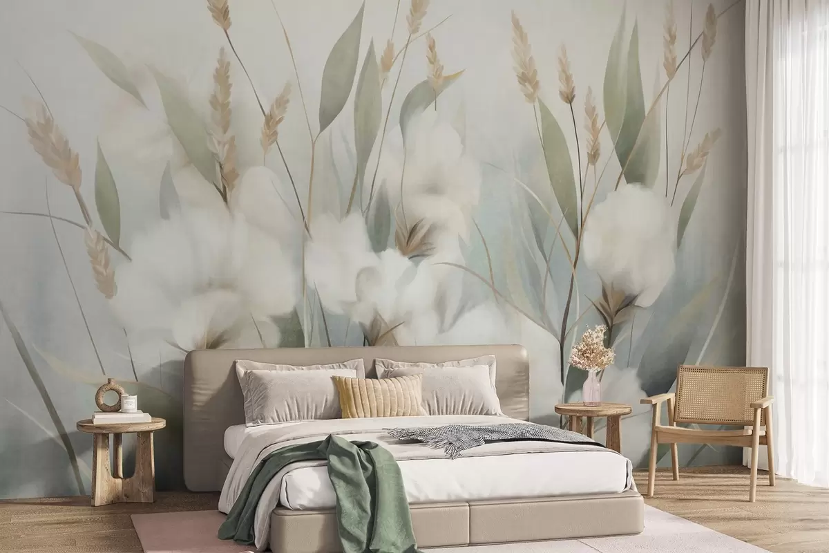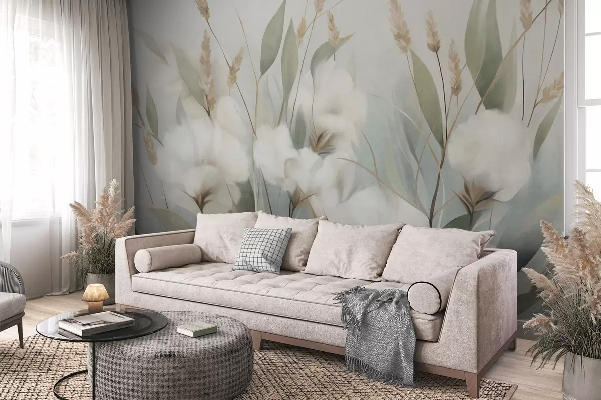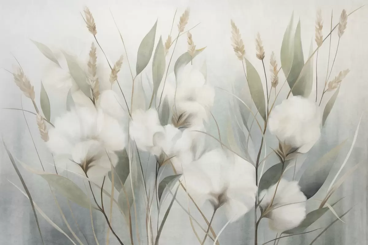 Murais de parede Flores secas brancas e grama alta contra um fundo suave e discreto, pintadas em estilo impressionista Nr. w09823