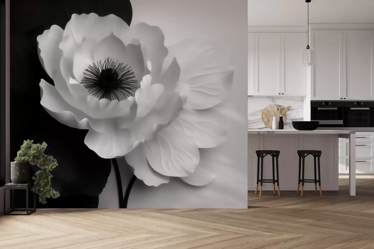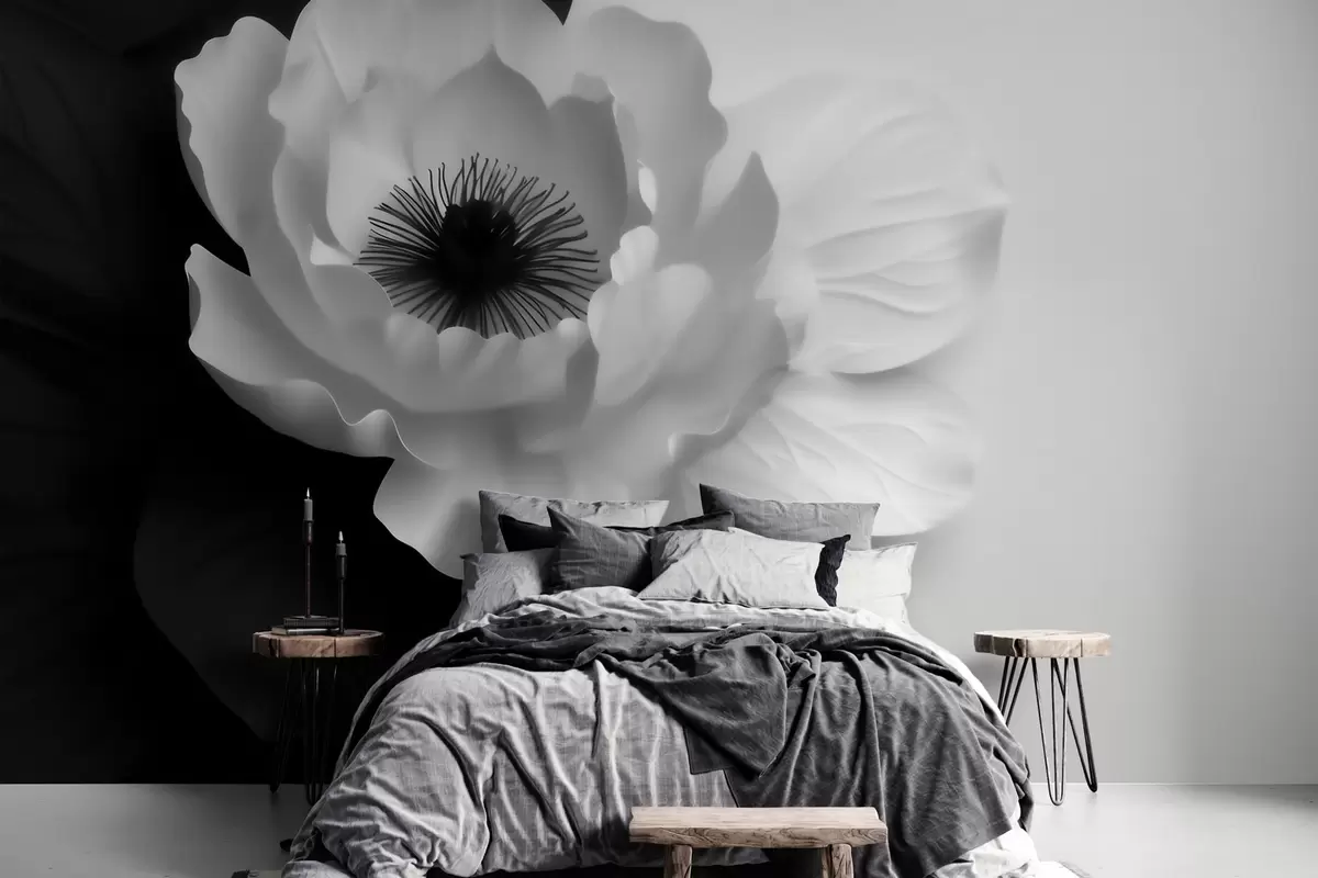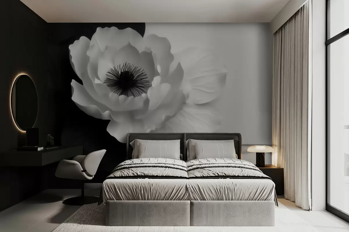Murais de parede Uma flor branca em contraste com o centro escuro, sobre um fundo em preto e branco Nr. w09852