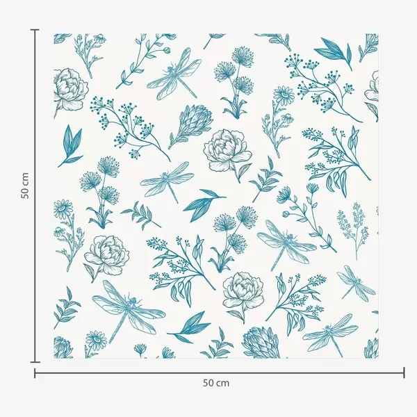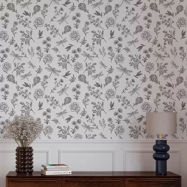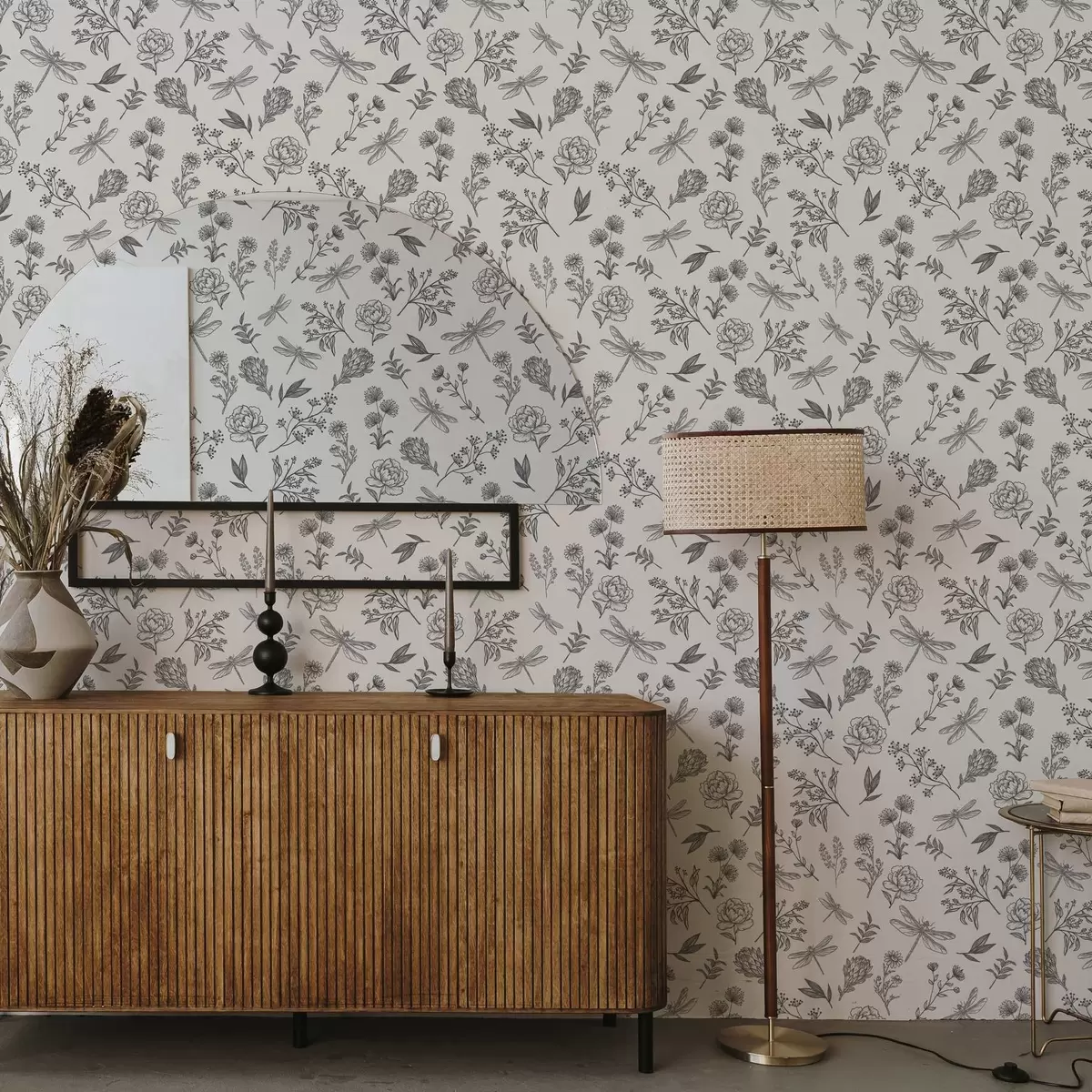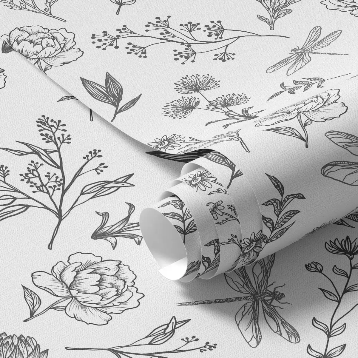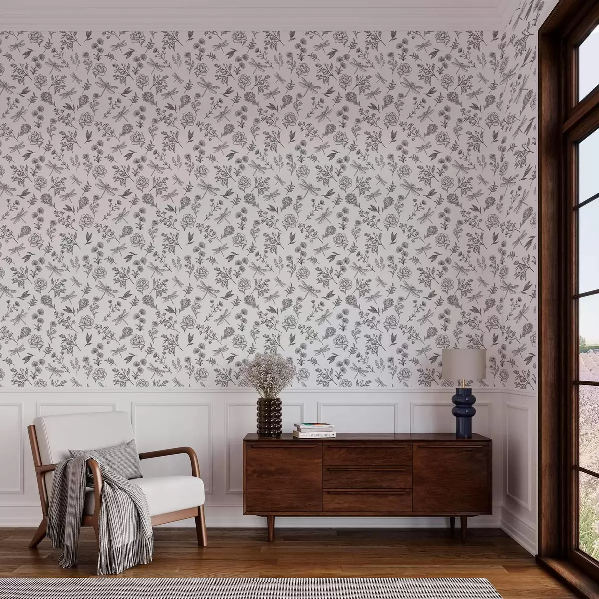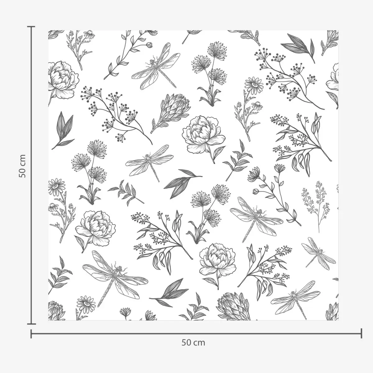 Papel de parede Flores, folhas e libélulas em um fundo branco Nr. a00025v1