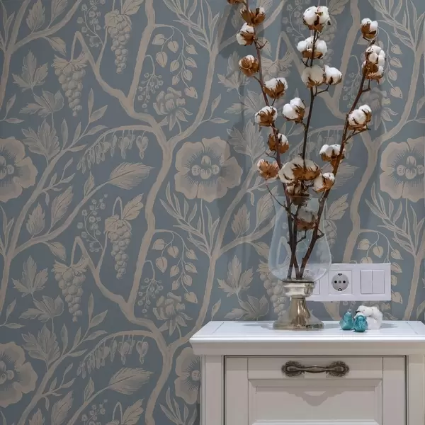 Papel de parede Flores brancas, caules e uvas em um fundo azul Nr. a00044