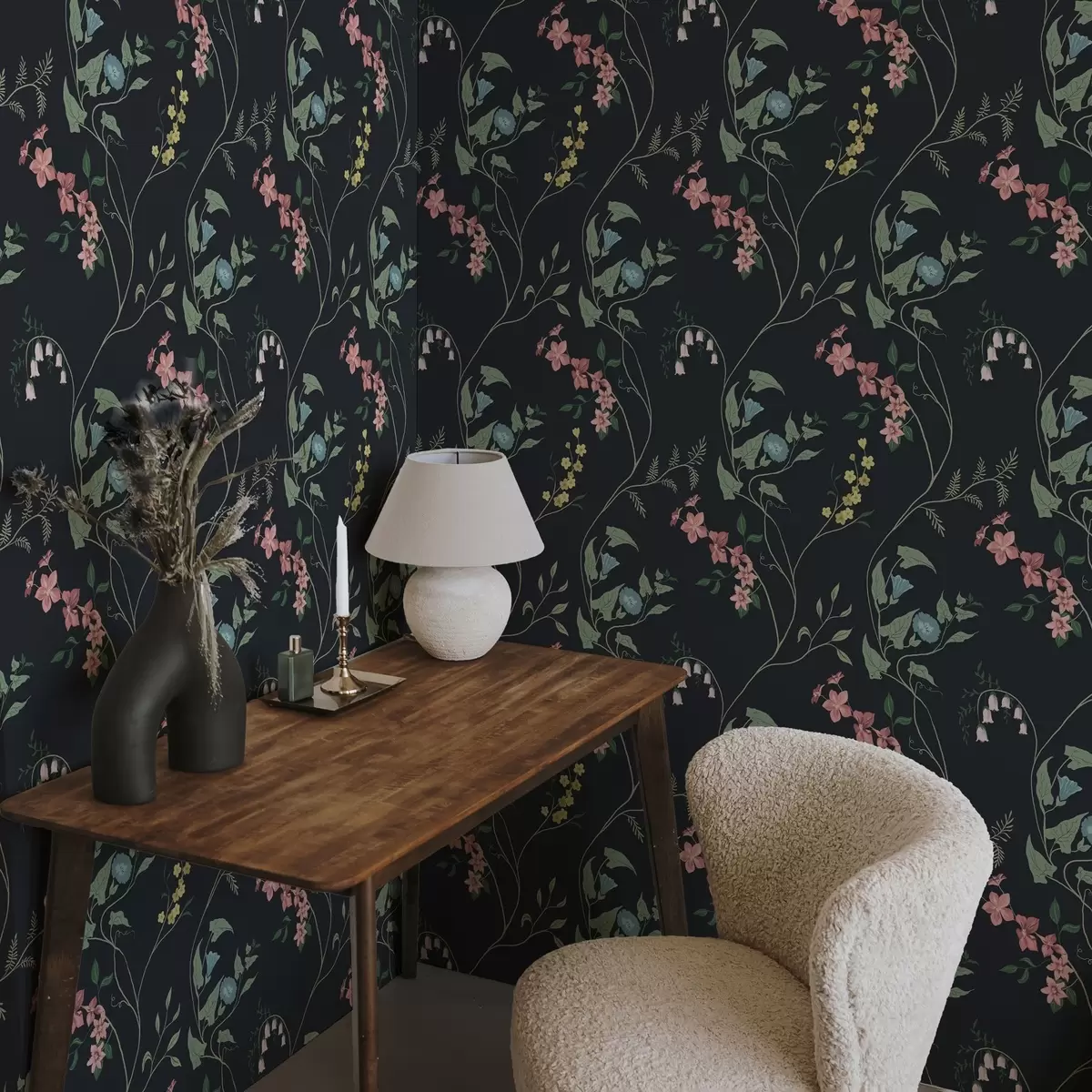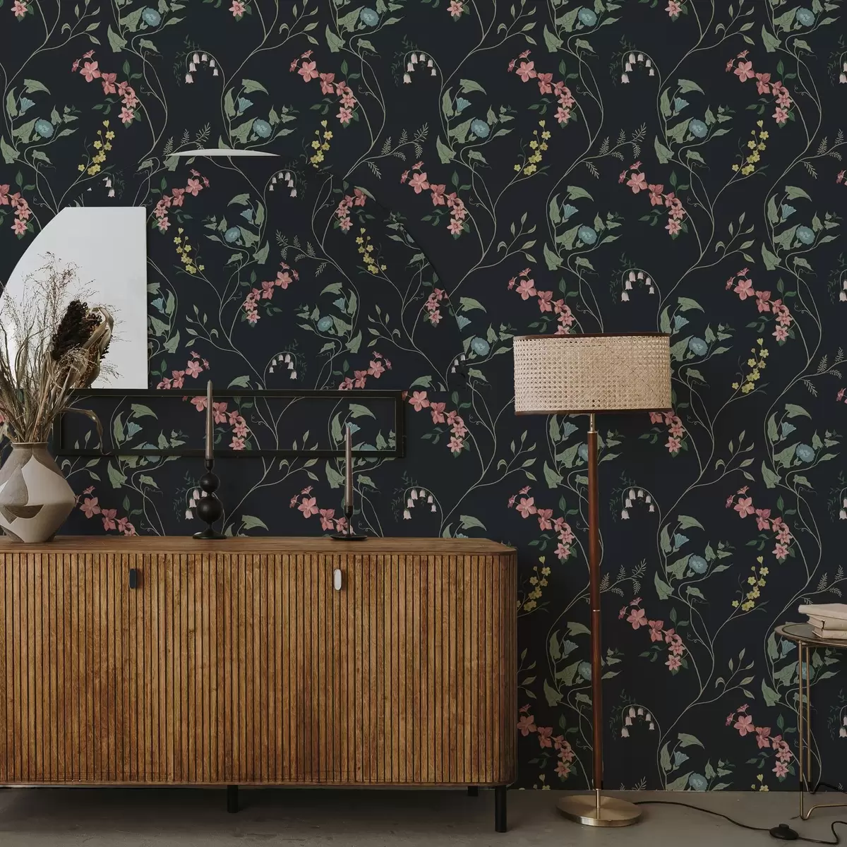 Papel de parede Flores, folhas e caules em um fundo escuro Nr. a00047