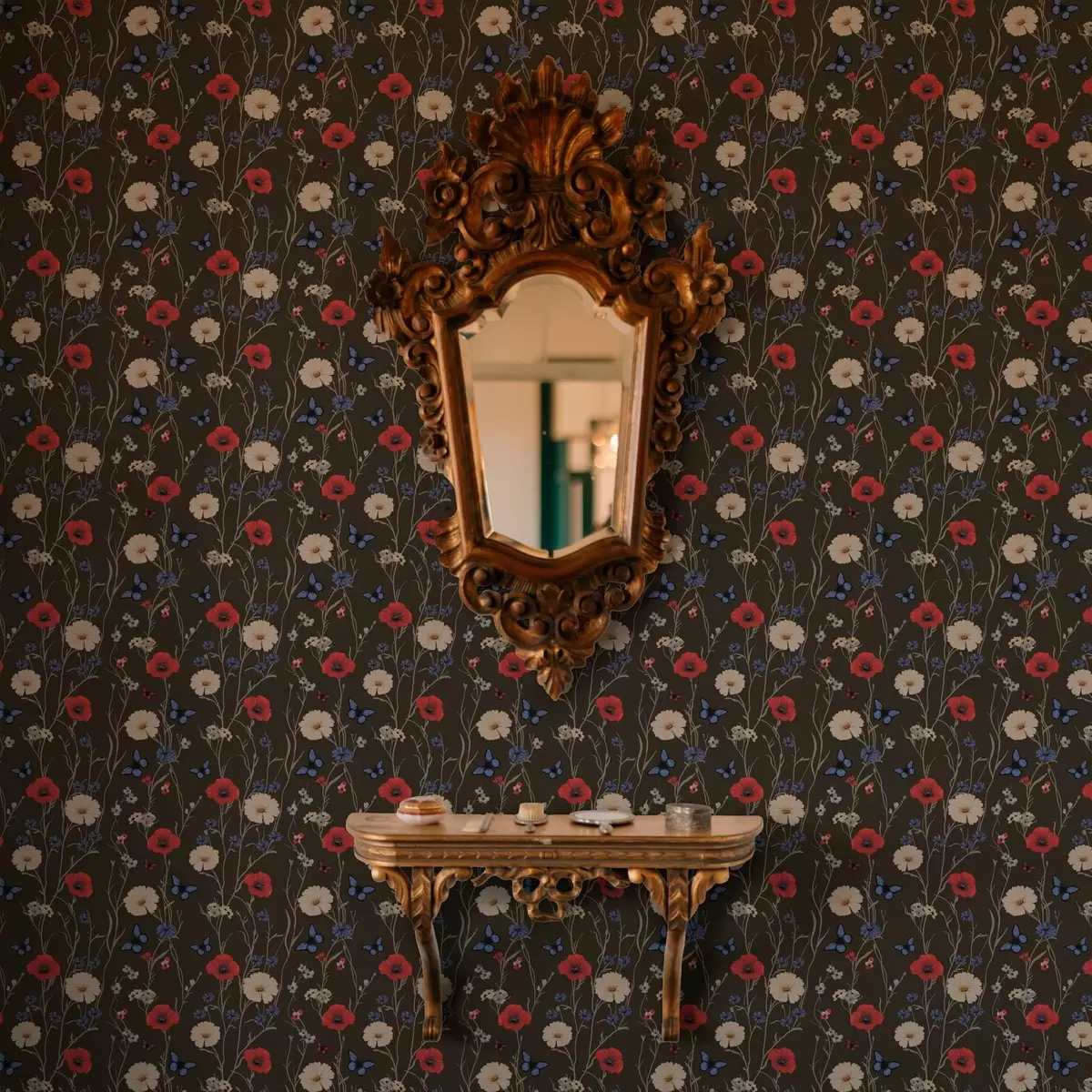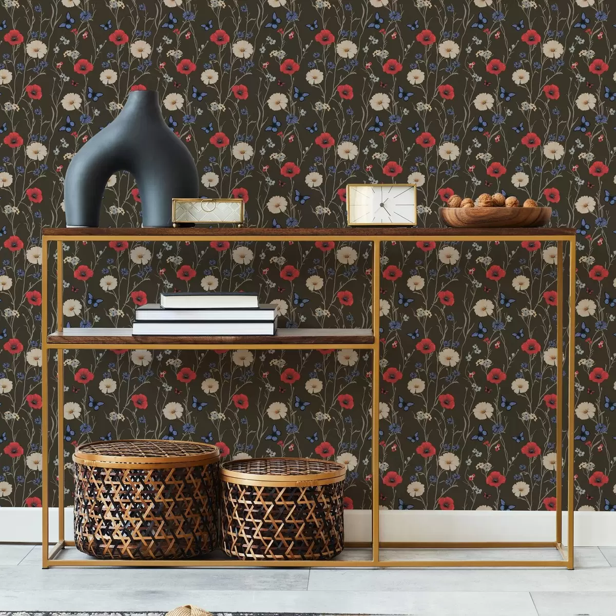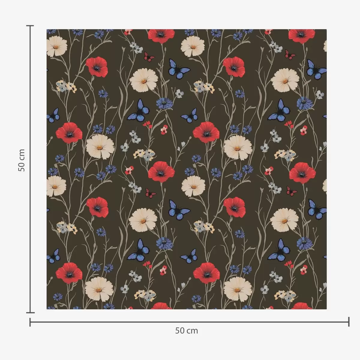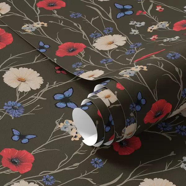 Papel de parede Papoulas, margaridas e borboletas em um fundo escuro Nr. a00072v2