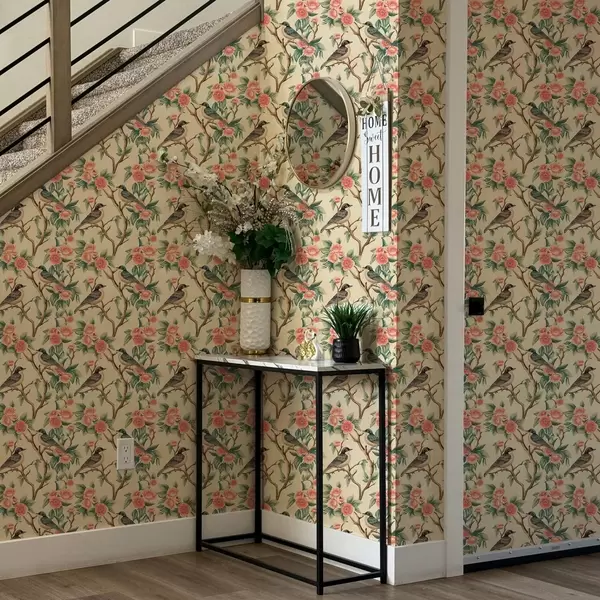 Papel de parede Pequenos pássaros em galhos com flores em um fundo claro Nr. a00093