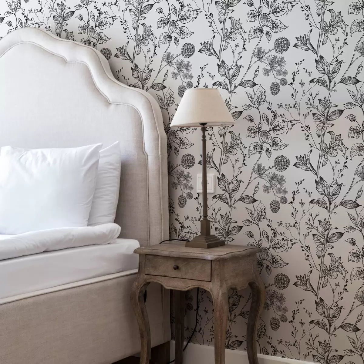 Papel de parede Ramos em preto e branco com folhas em um fundo branco Nr. a00098v1