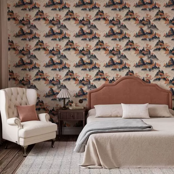 Papel de parede Montanhas de outono na neblina com árvores alaranjadas e pássaros a00104