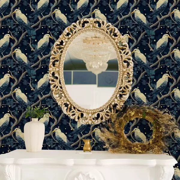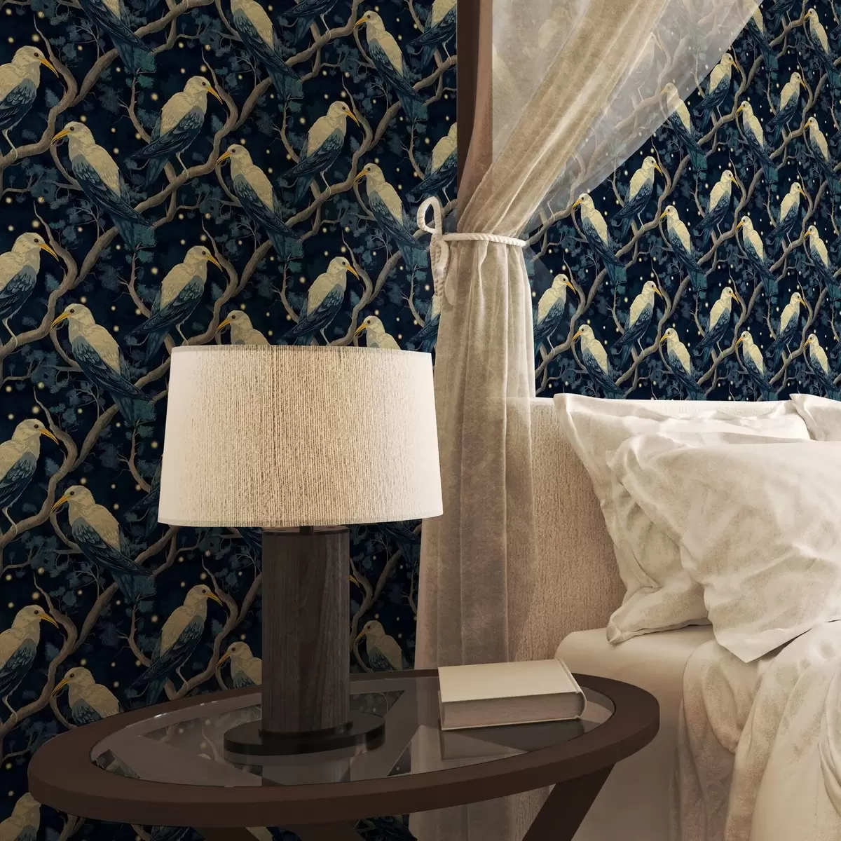 Papel de parede Pássaros brancos em galhos entre vagalumes brilhantes na floresta noturna Nr. a00109