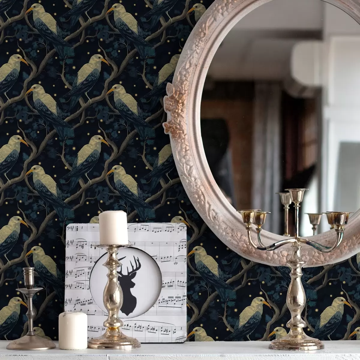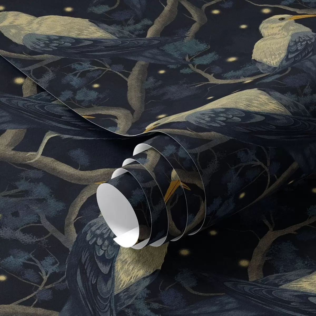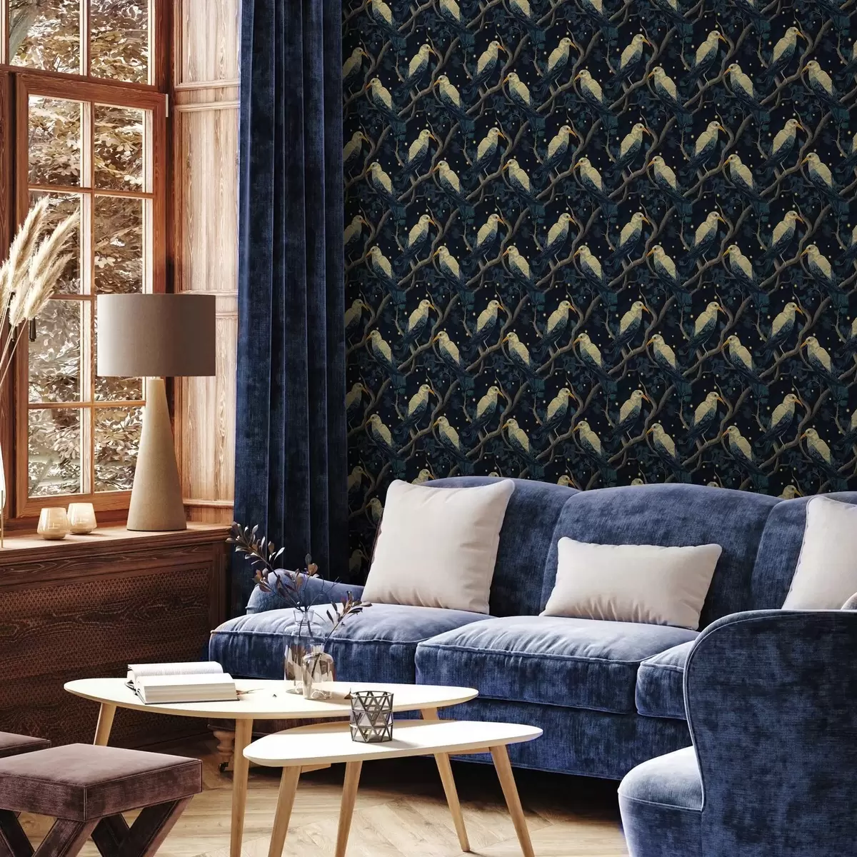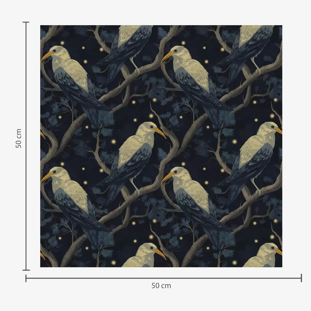 Papel de parede Pássaros noturnos em galhos e estrelas em um fundo azul escuro Nr. a00109v1