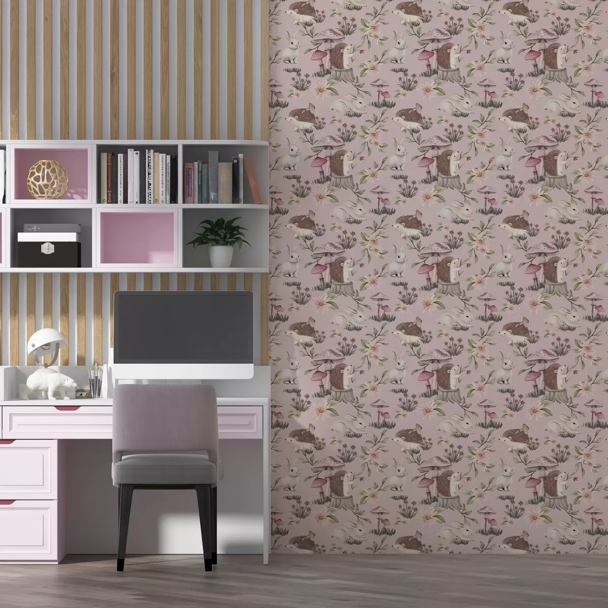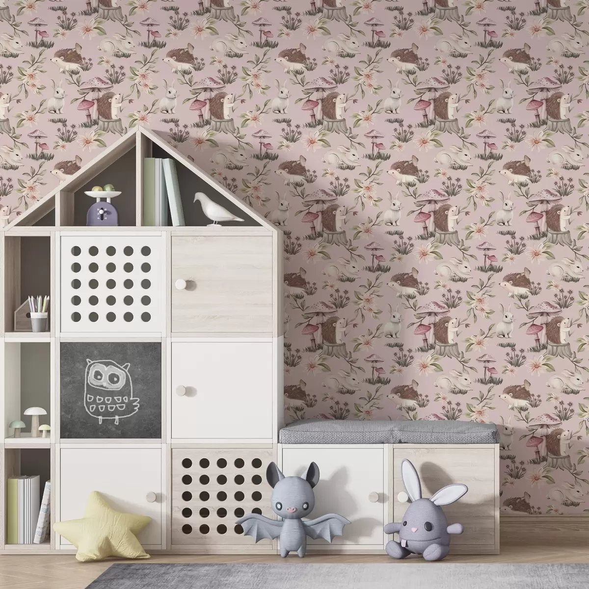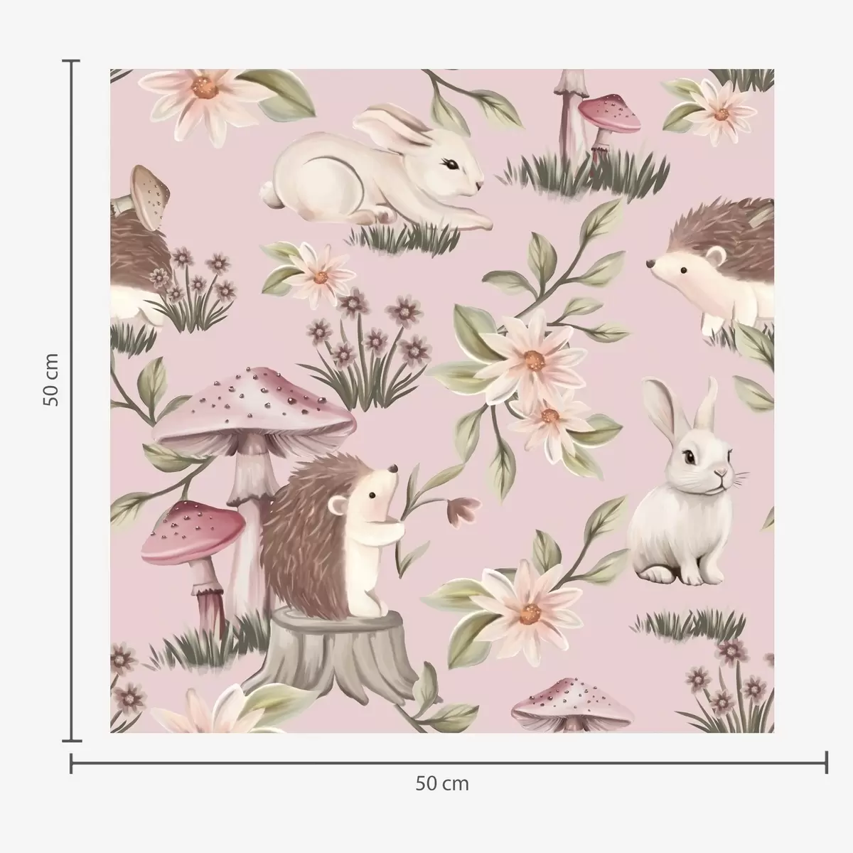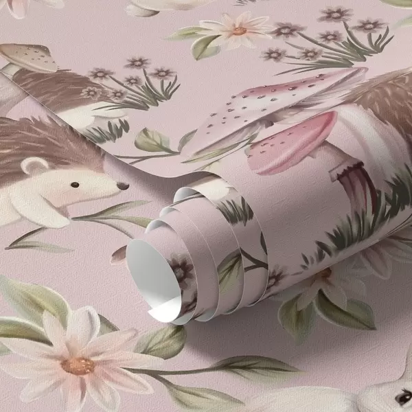 Papel de parede Ouriços, coelhos e flores em estilo de conto de fadas entre cogumelos em um fundo rosa Nr. a00111
