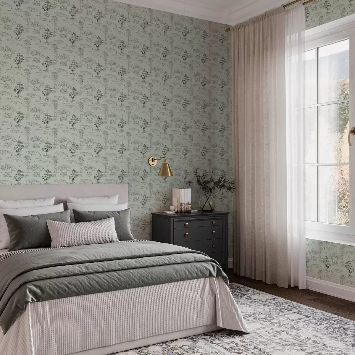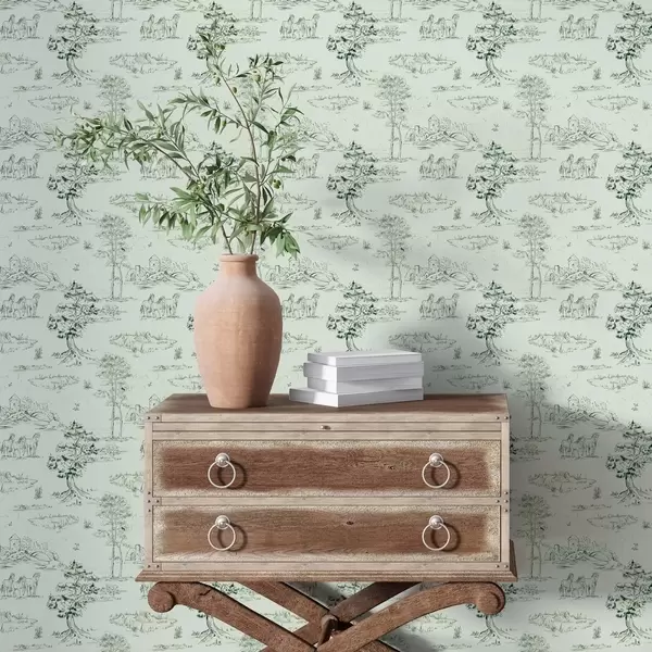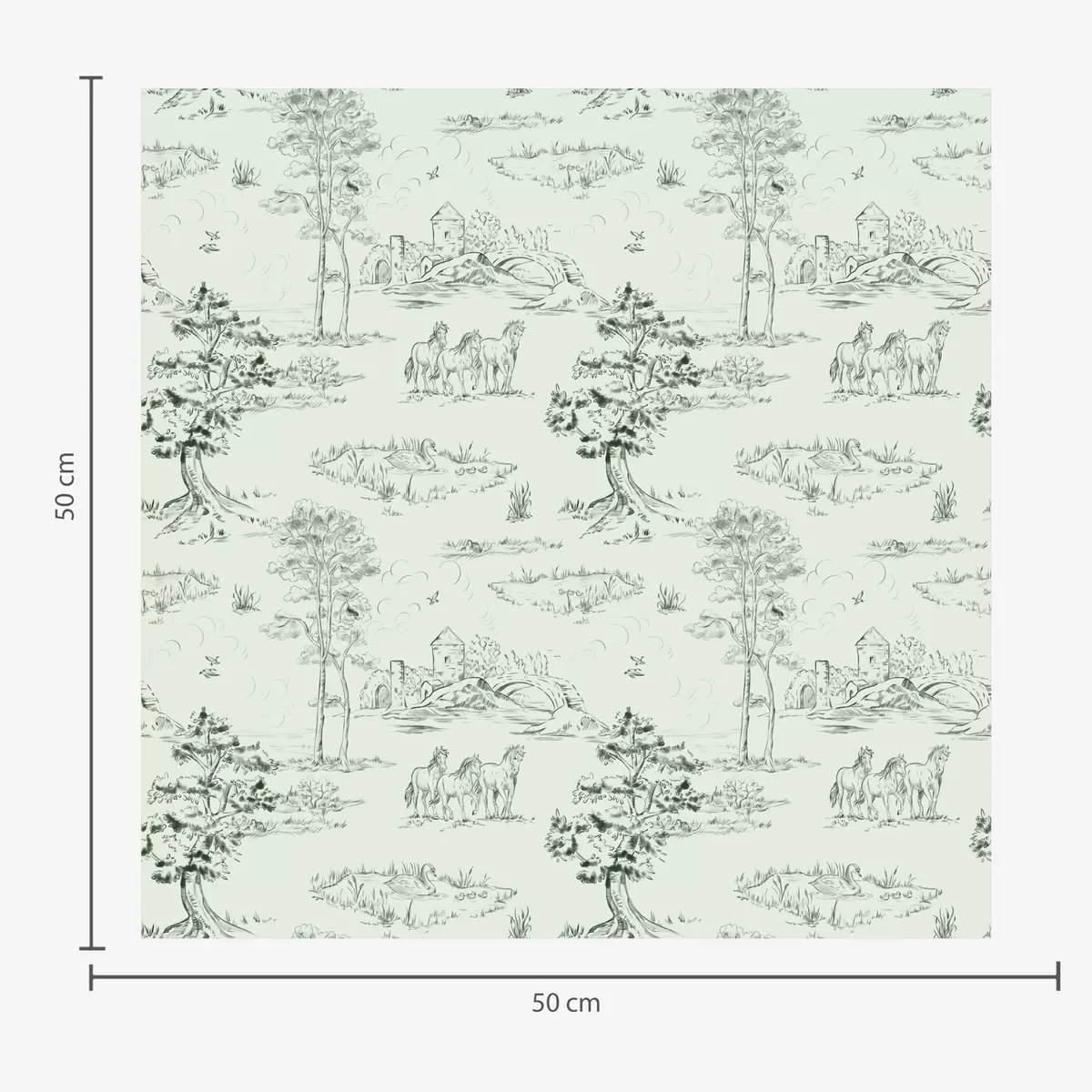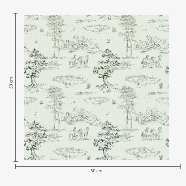 Papel de parede Cena com cavalos, árvores e castelo em um fundo verde Nr. a00133v1