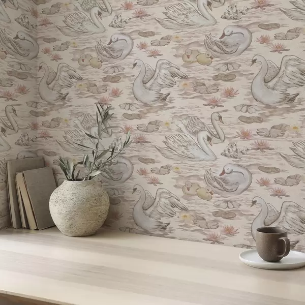 Papel de parede Cisnes com filhotes em um fundo rosa com nenúfares Nr. a00176