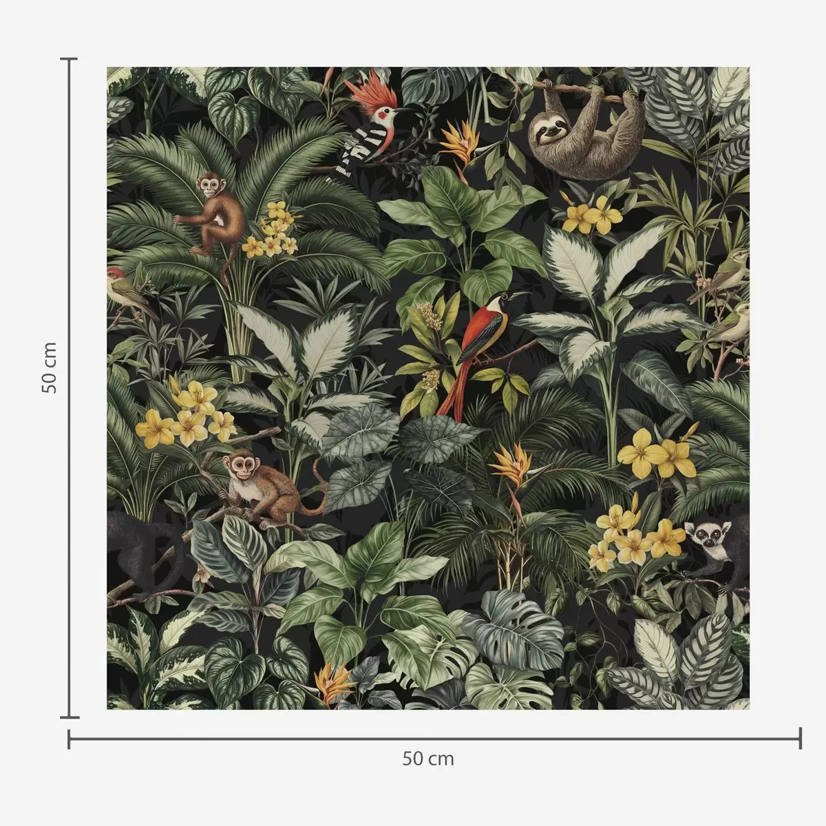 Papel de parede Selva tropical com macacos, pássaros e folhagem densa Nr. a00191