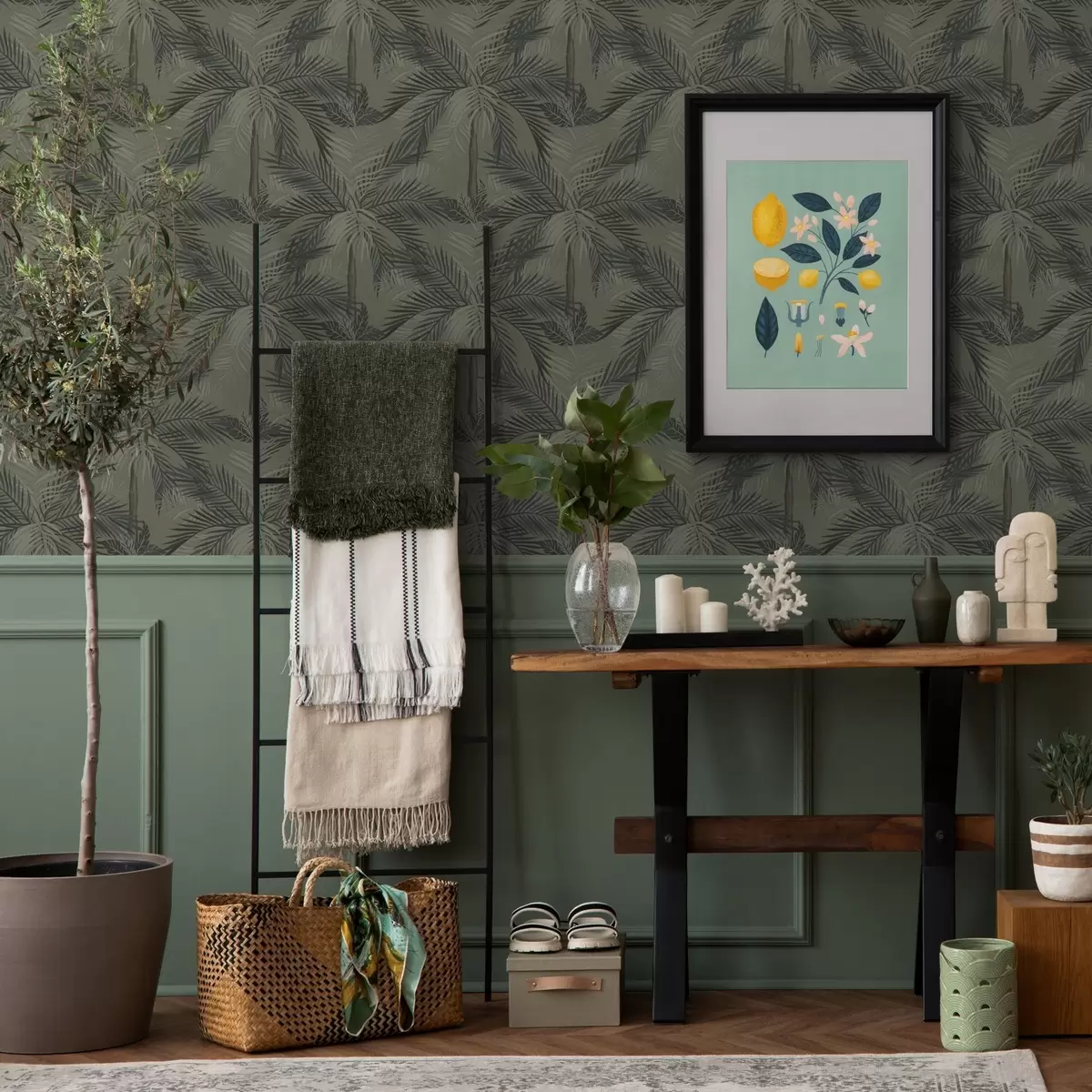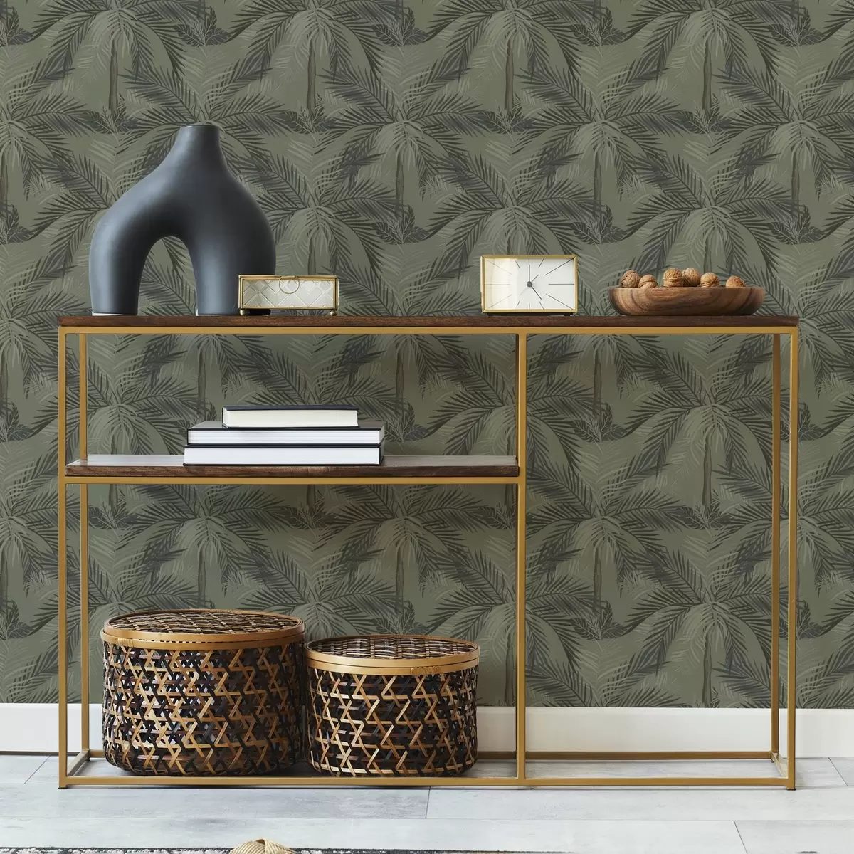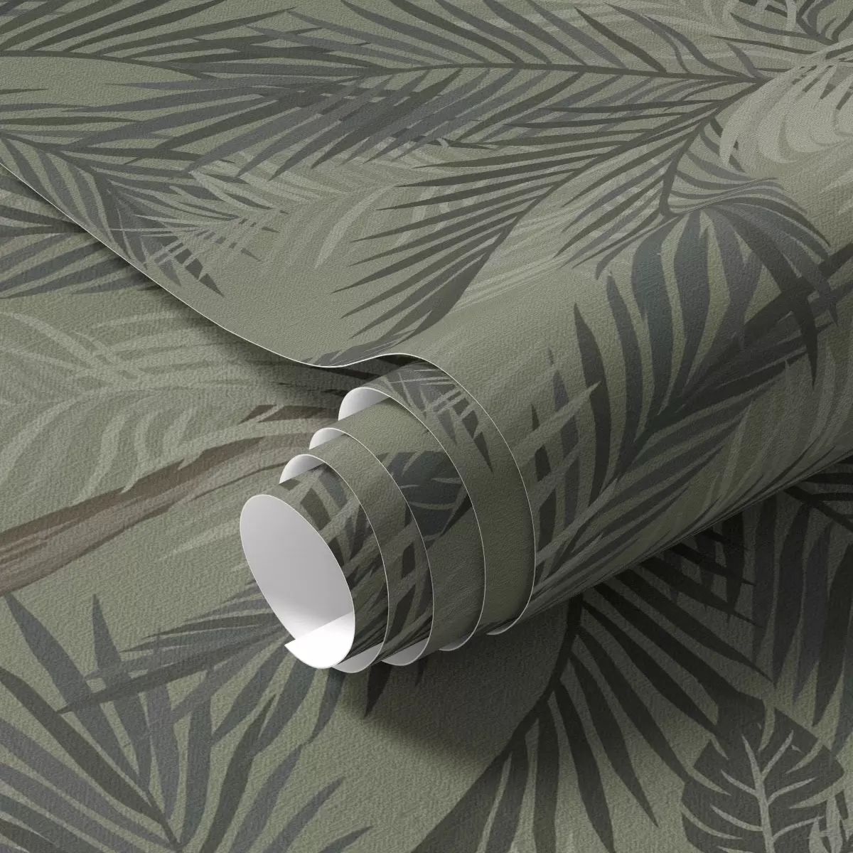 Papel de parede Folhas de palmeira em fundo de oliveira, selva, trópicos Nr. a00217