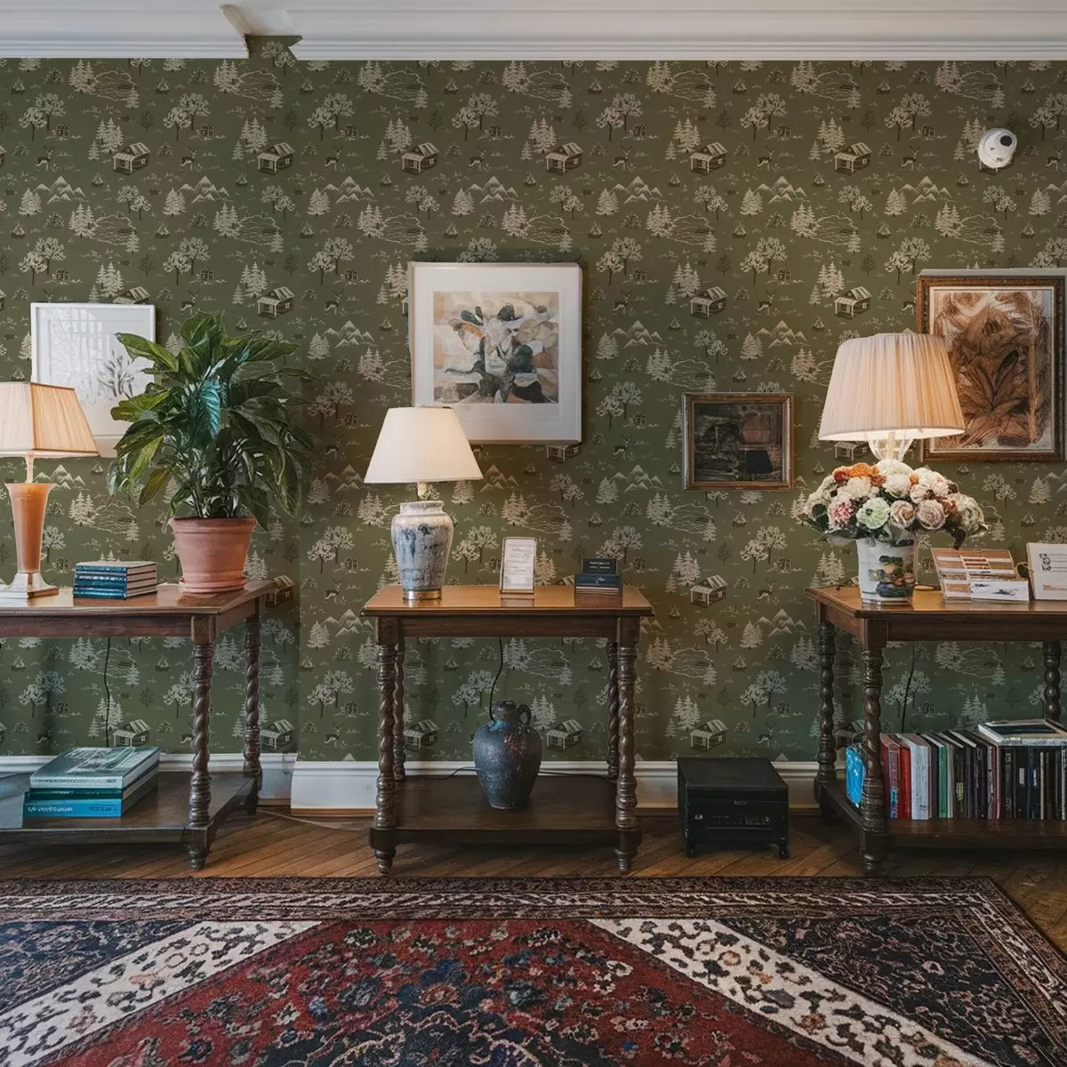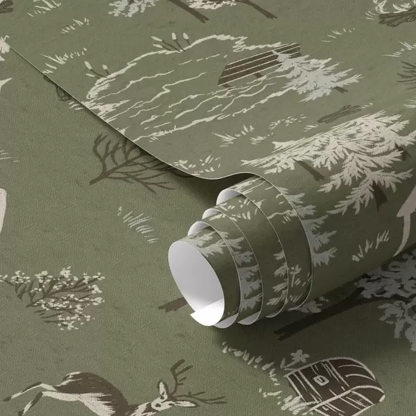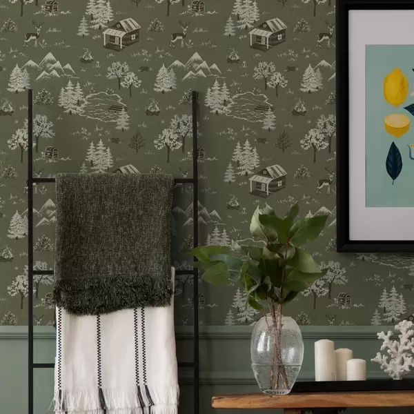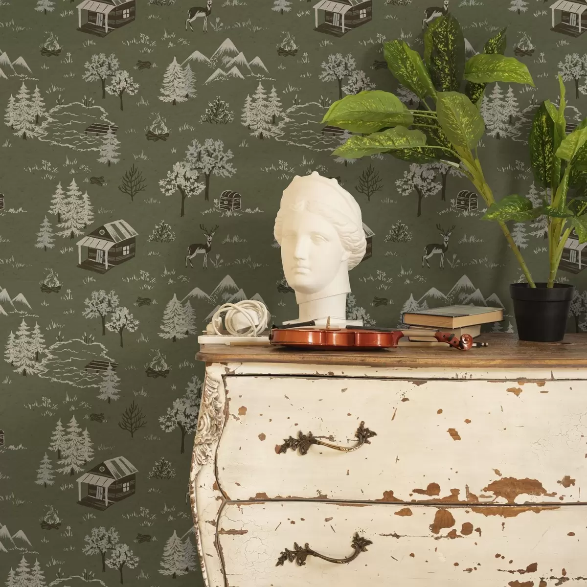 Papel de parede Floresta pintada com um lago, uma cabana e animais a00267