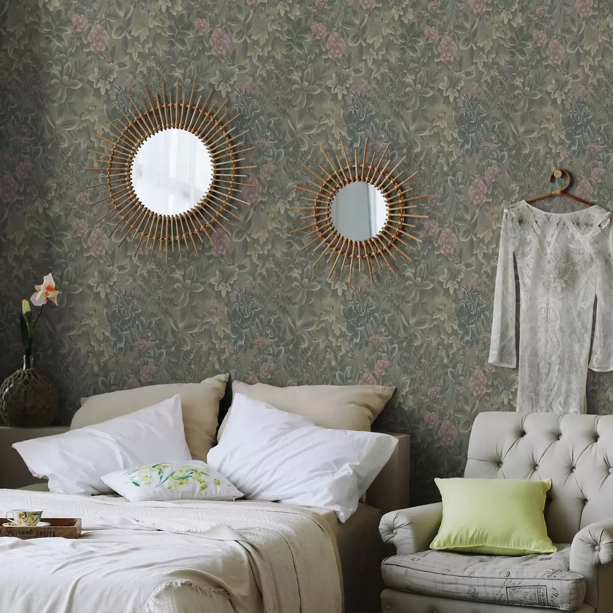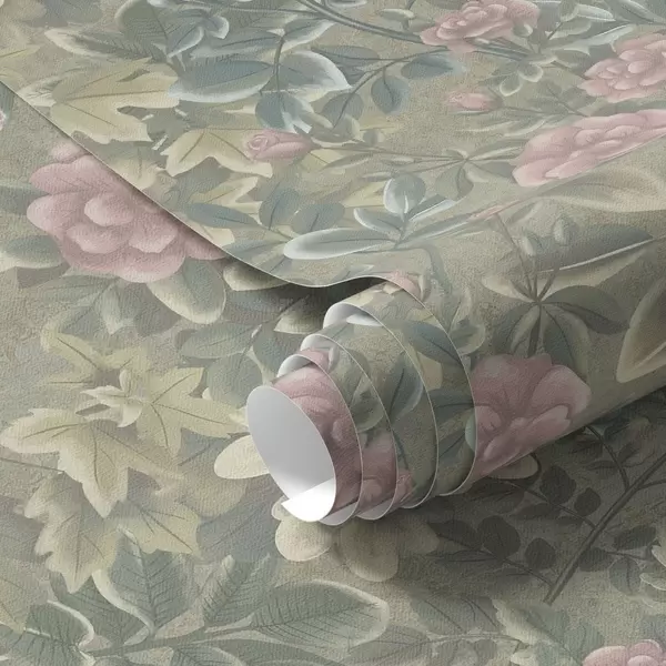 Papel de parede Flores e folhas cor-de-rosa em um fundo verde pastel Nr. a00306