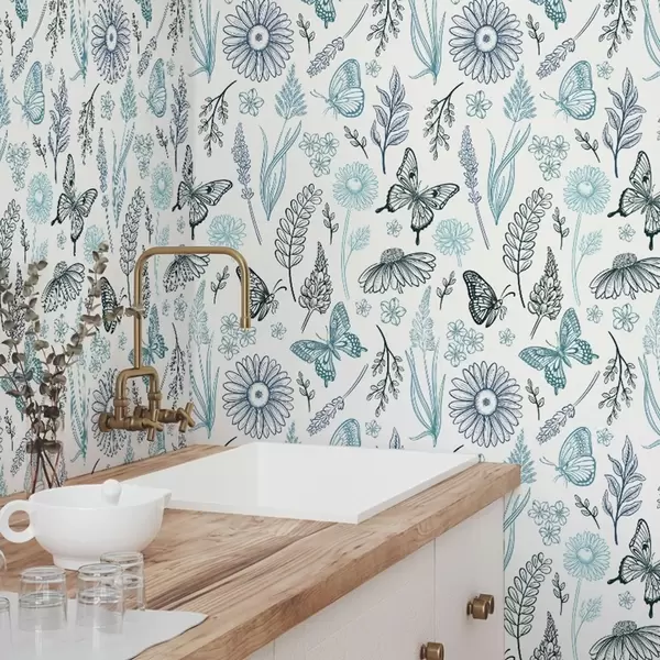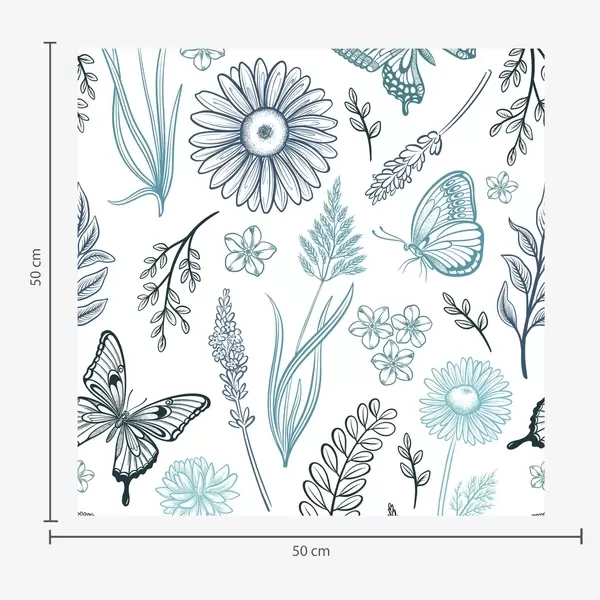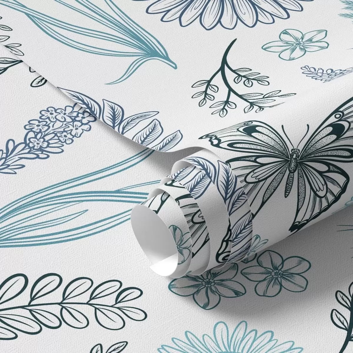 Papel de parede Borboletas de contorno e flores em tons de azul e azul Nr. a00311