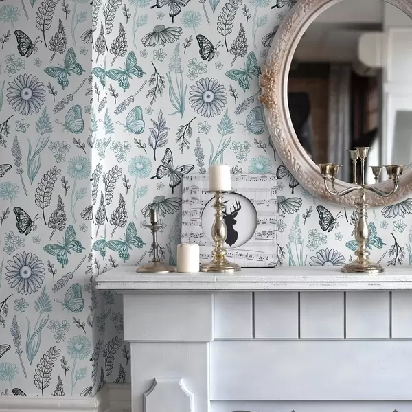 Papel de parede Borboletas de contorno e flores em tons de azul e azul Nr. a00311