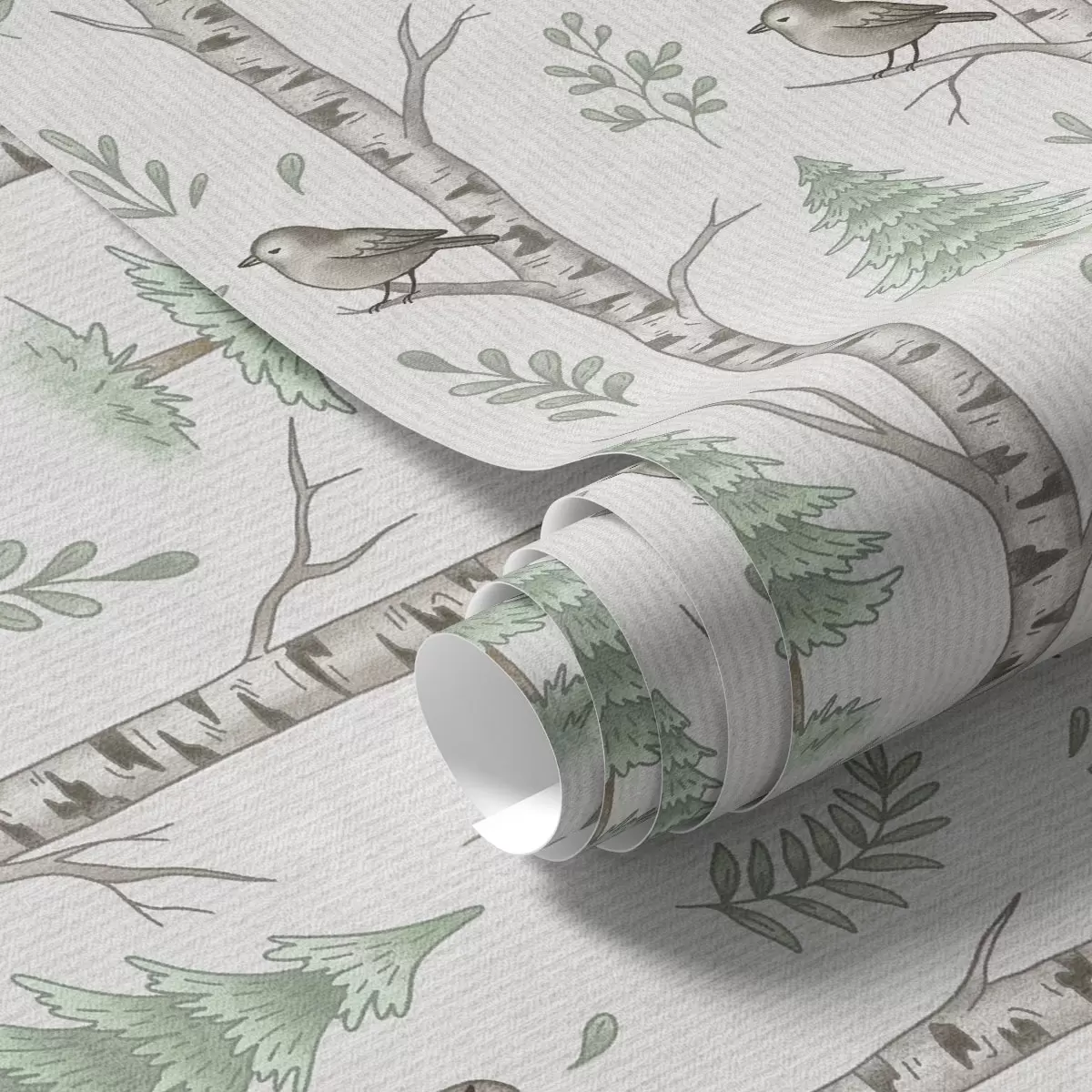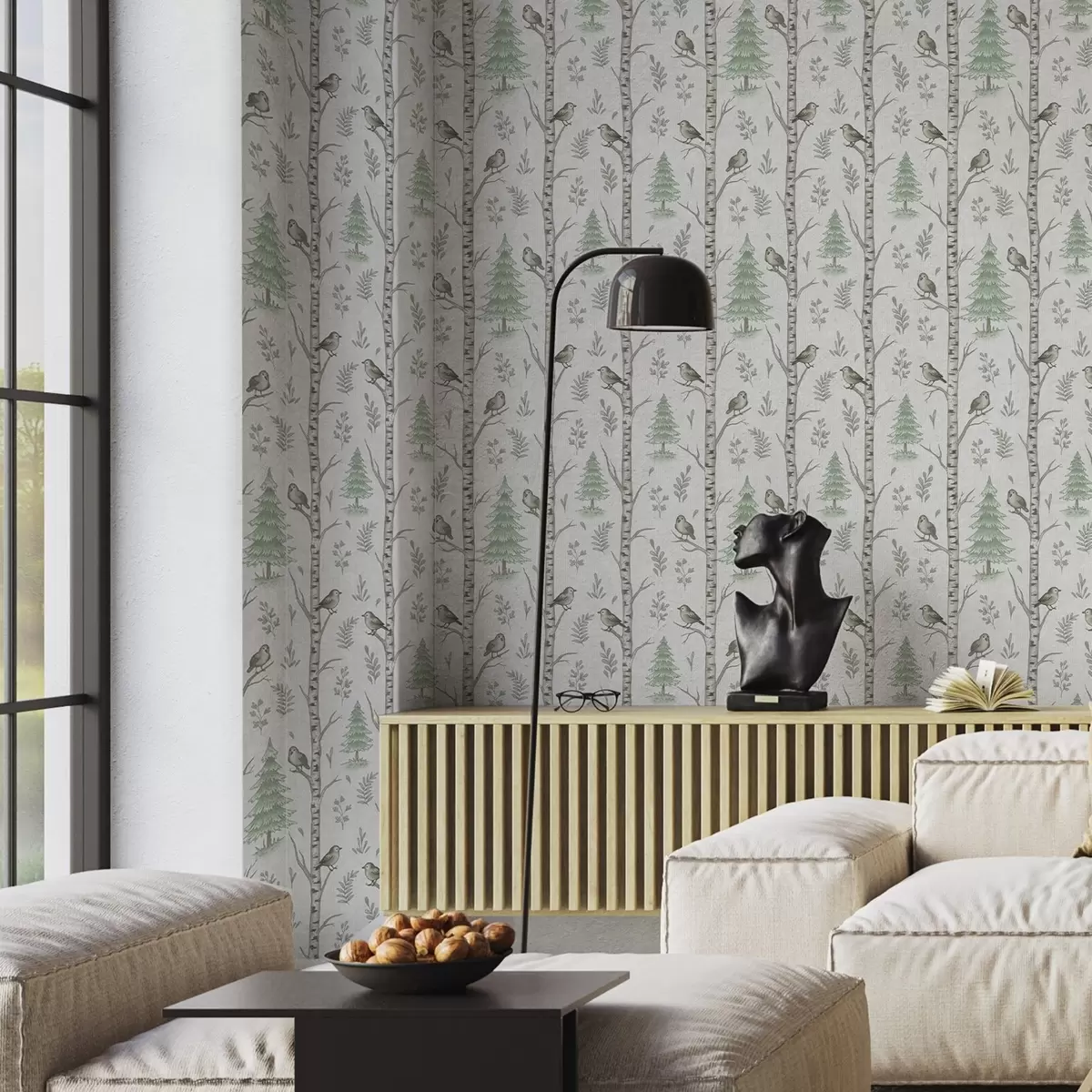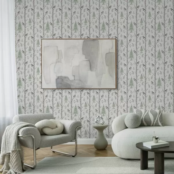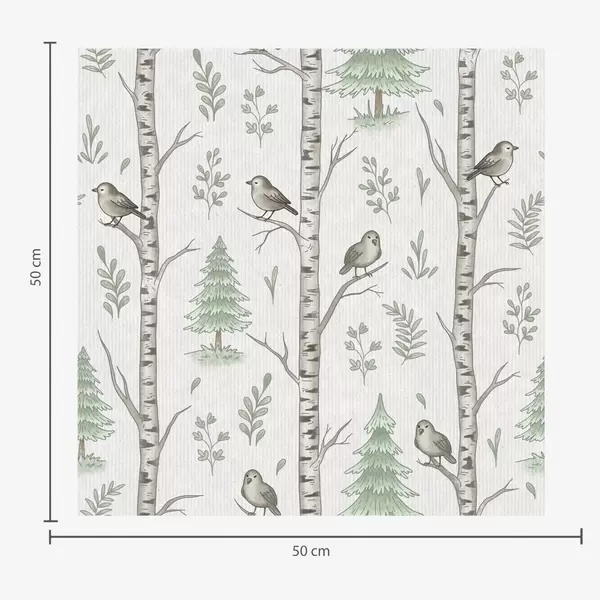 Papel de parede Bétulas com pássaros em uma floresta verde-clara Nr. a00316
