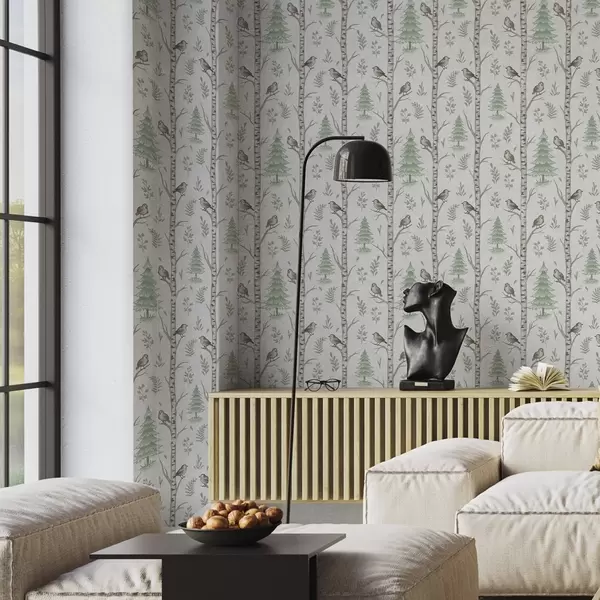 Papel de parede Bétulas com pássaros em uma floresta verde-clara a00316