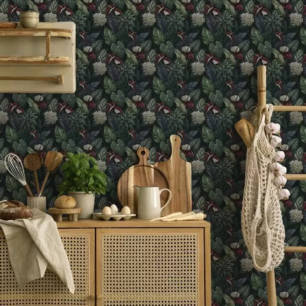 Papel de parede Folhas tropicais com flores brancas e vermelhas Nr. a00361