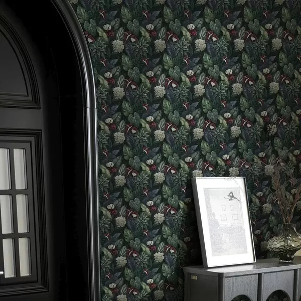 Papel de parede Folhas tropicais com flores brancas e vermelhas Nr. a00361