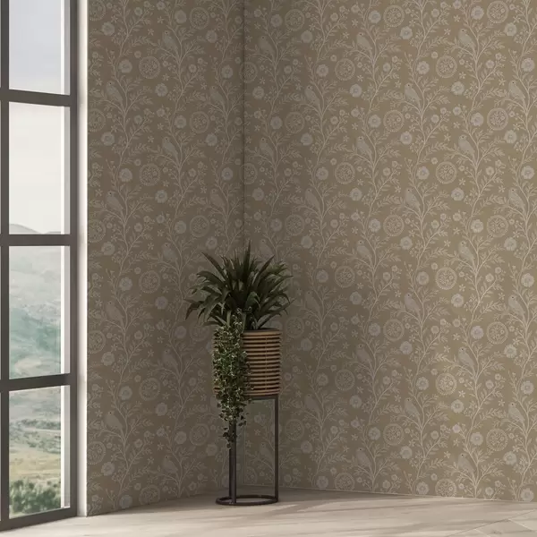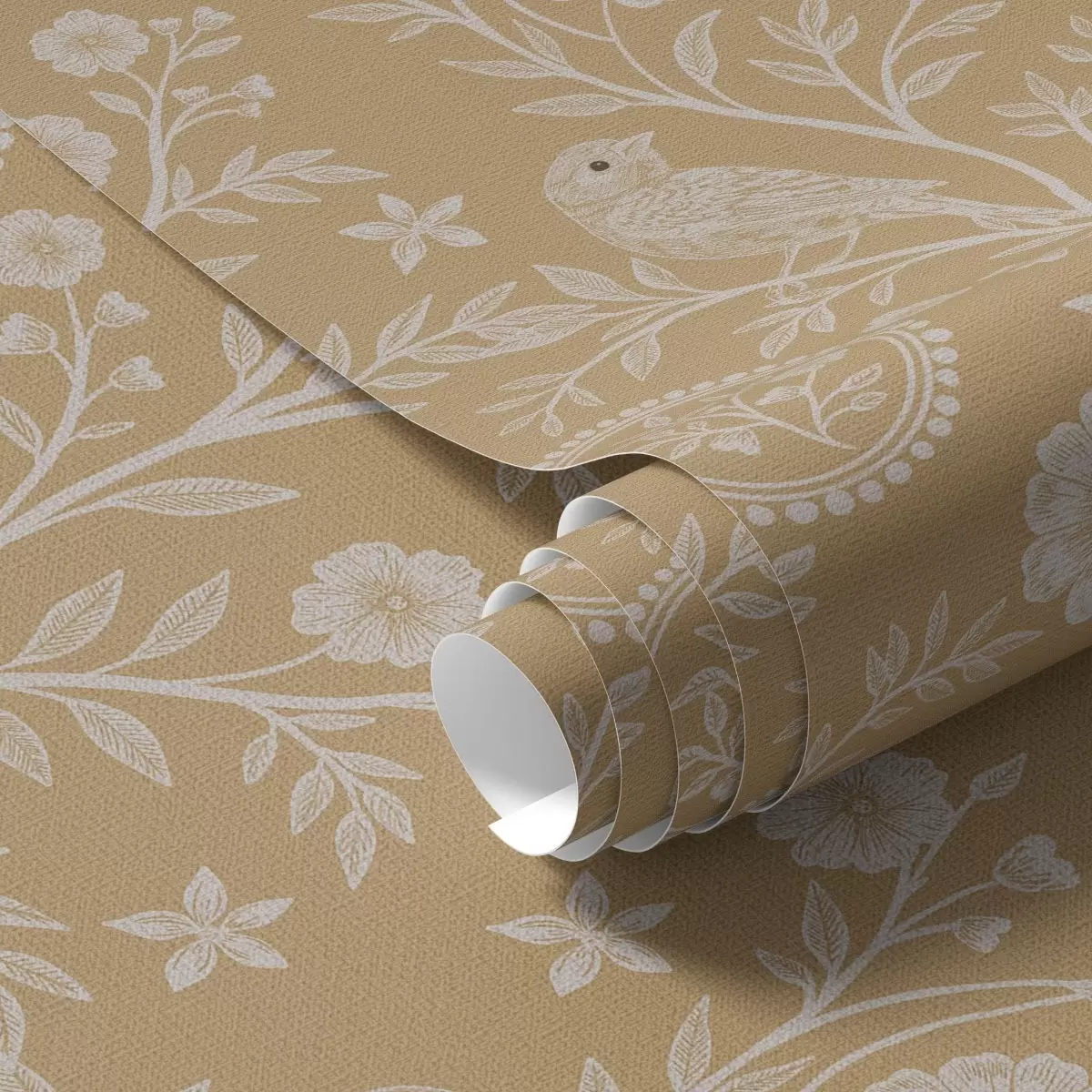 Papel de parede Esboço delicado de um pássaro branco e uma flor pássaro branco e uma flor em um fundo ocre Nr. a00393