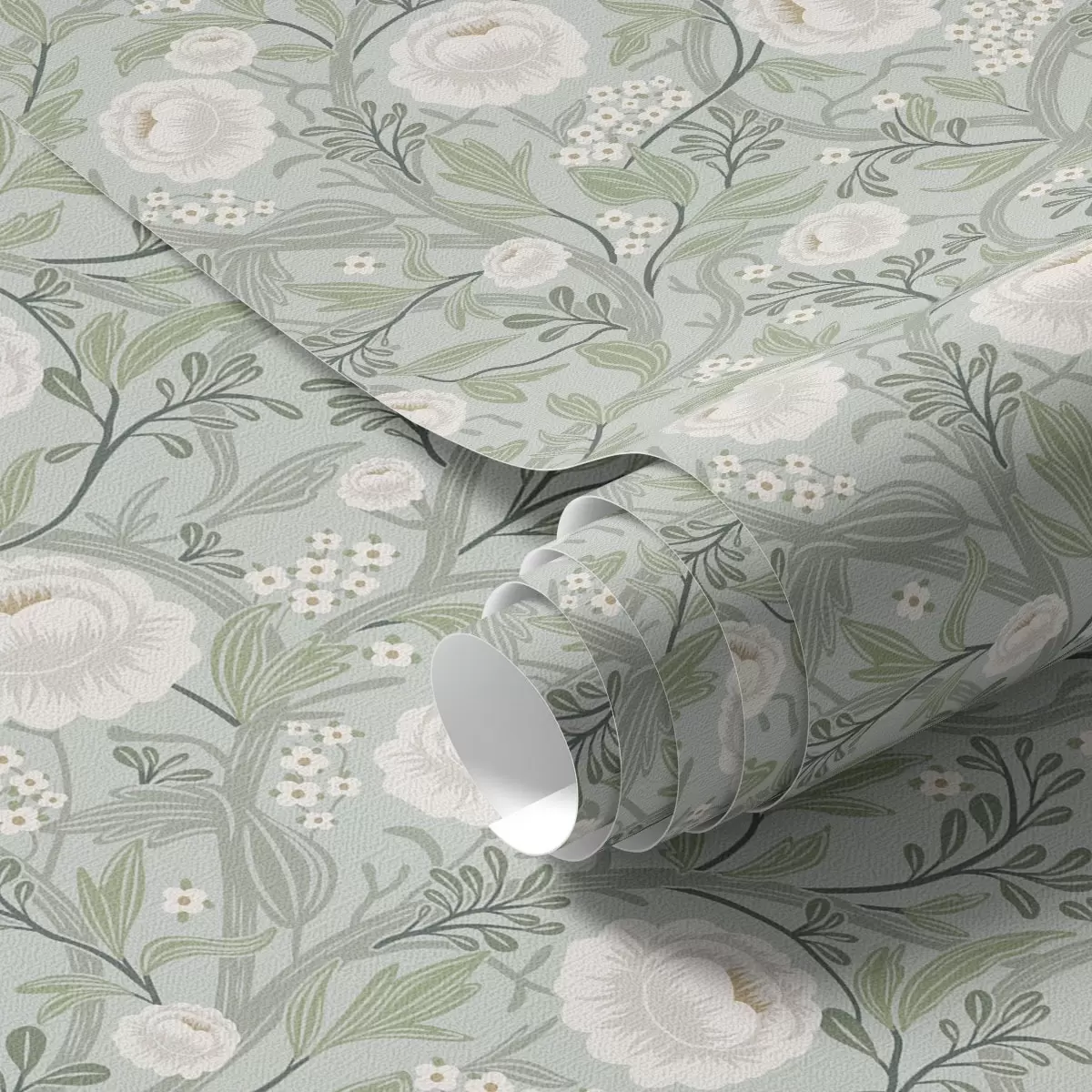 Papel de parede Folhas verdes suaves e flores cremosas com folhas verdes e flores cremosas com vinhas graciosas a00398