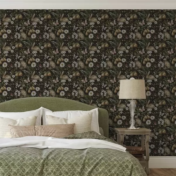 Papel de parede Coelhos, peras, flores e insetos realistas em um fundo escuro Nr. a00401
