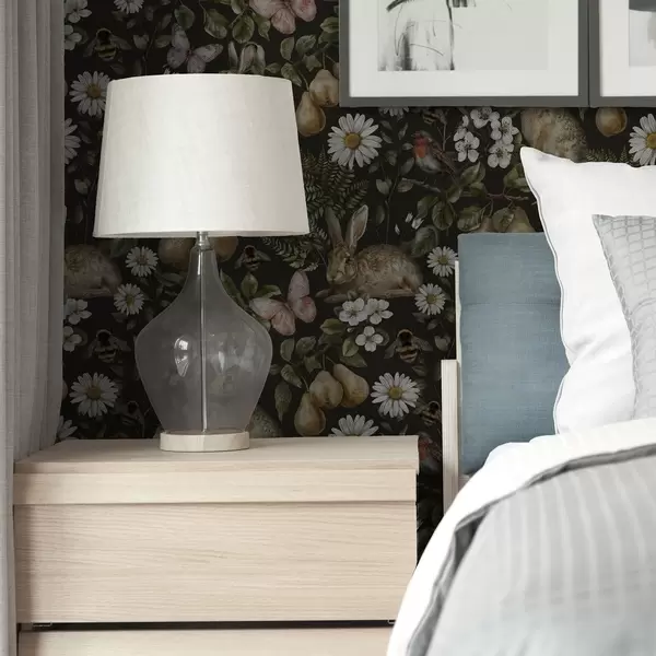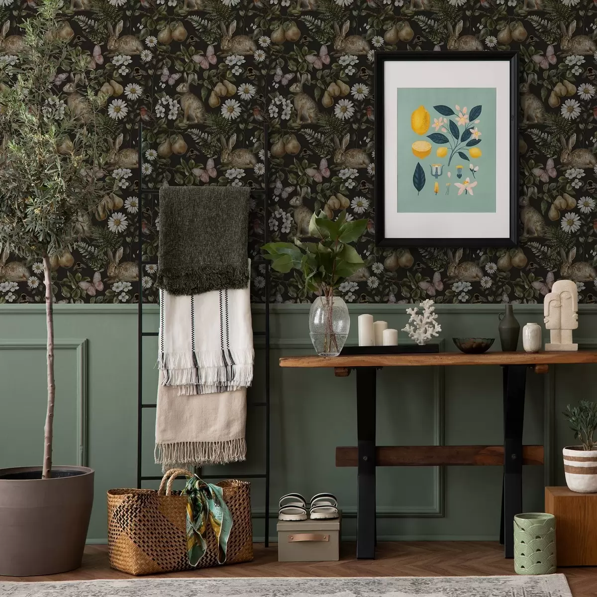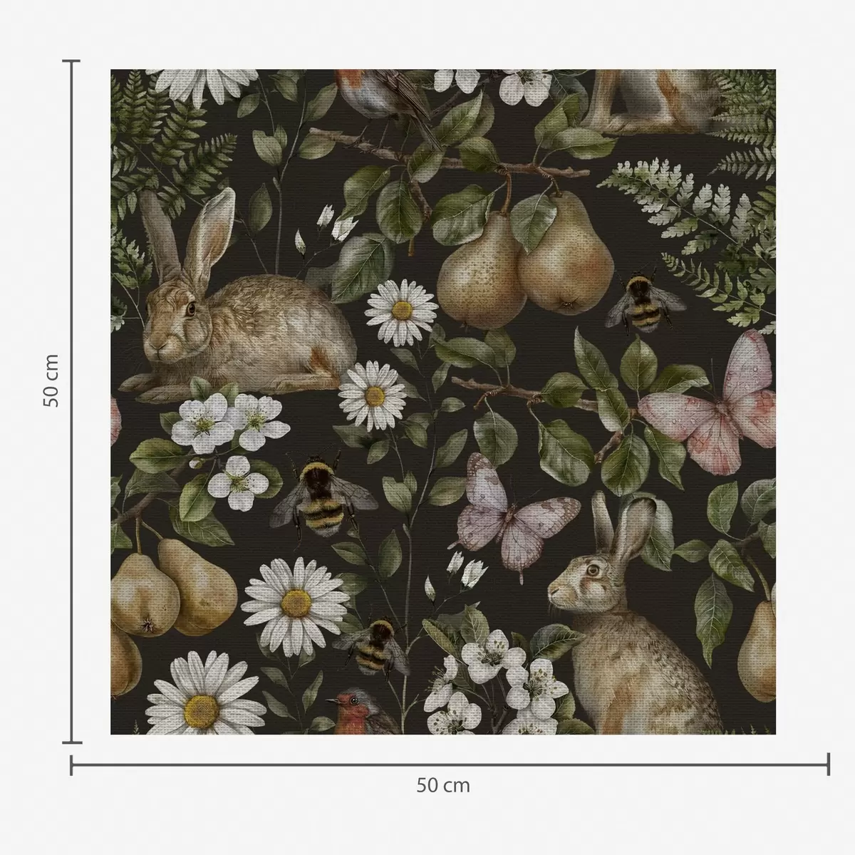 Papel de parede Coelhos, peras, flores e insetos realistas em um fundo escuro Nr. a00401