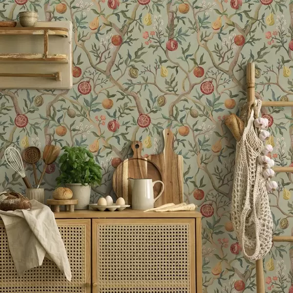 Papel de parede Frutas de romã, peras e flores em um fundo verde claro Nr. a00465