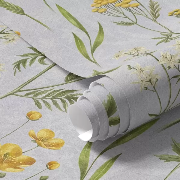 Papel de parede Flores amarelas e folhagens em um fundo cinza claro Nr. a00472