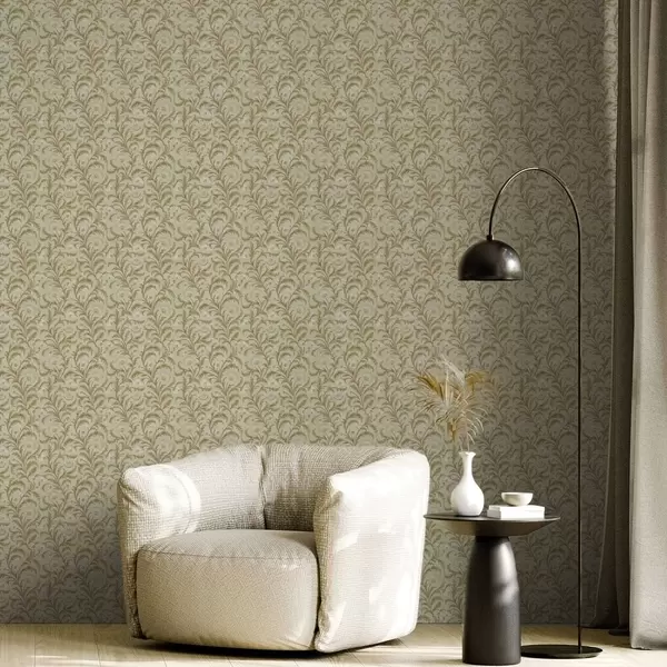 Papel de parede Ornamento vintage com volutas e flores, bege e verde-oliva a00574