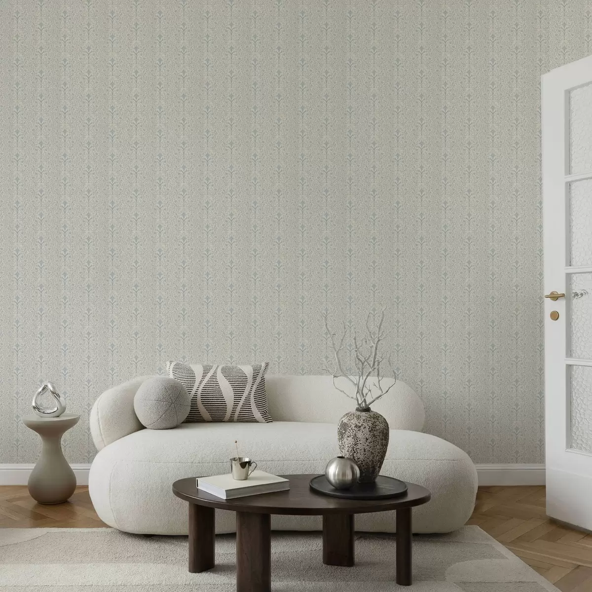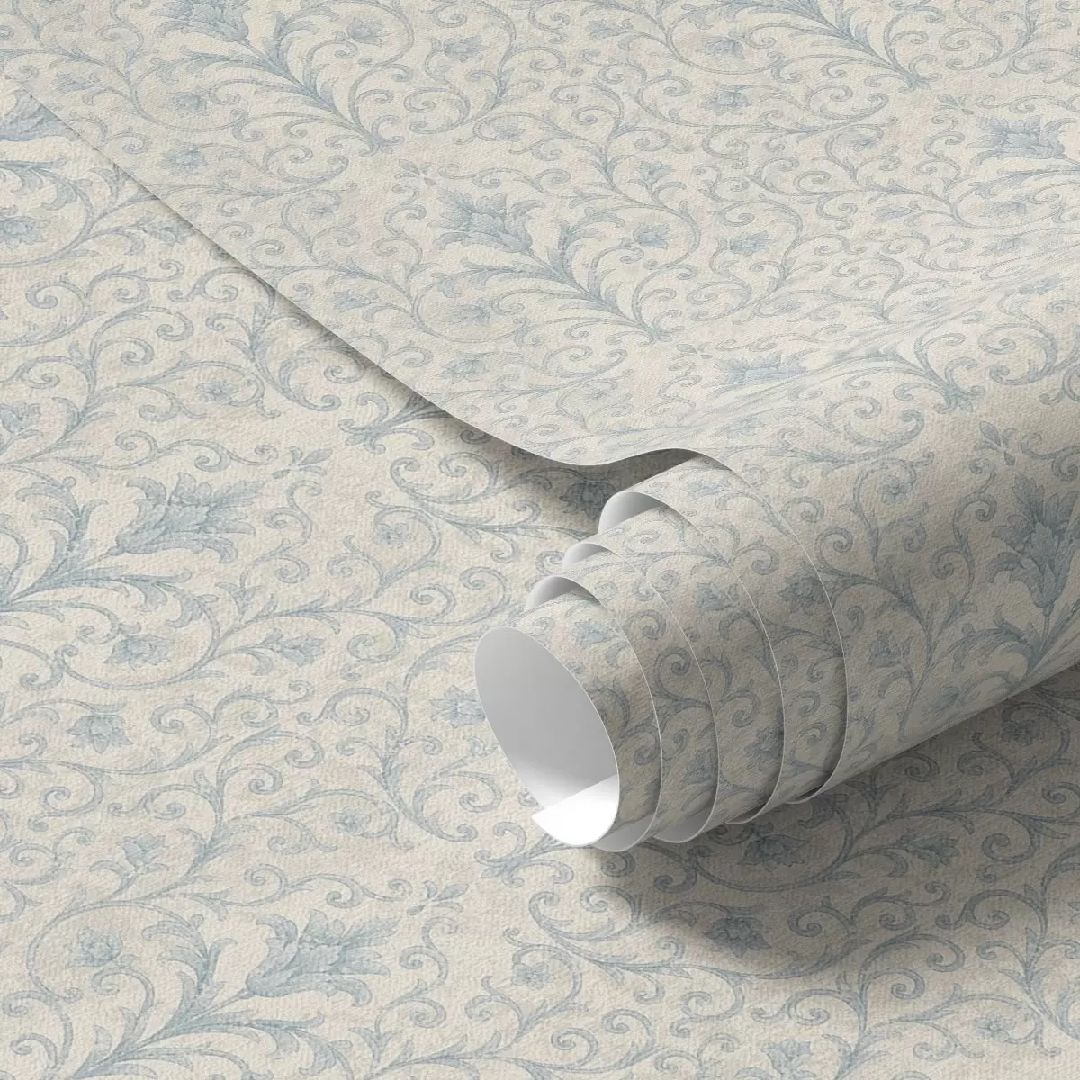 Papel de parede Damasco azul com arabescos sobre fundo creme a00578