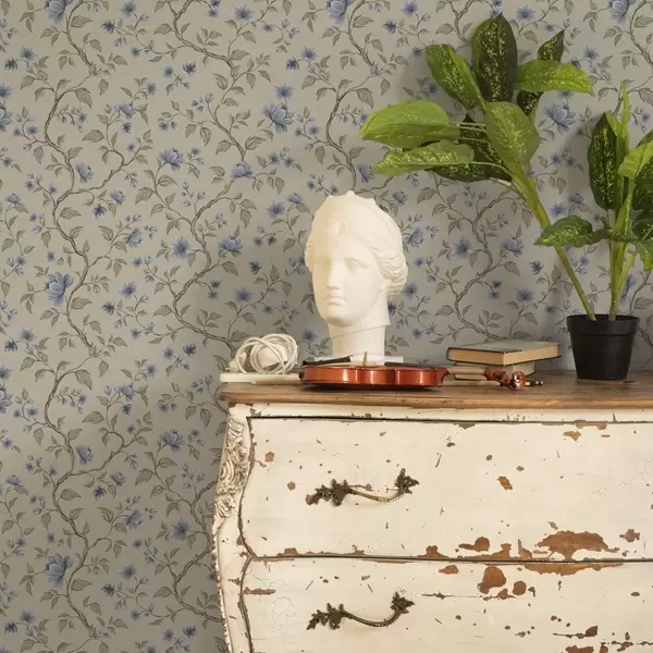 Papel de parede Galhos com flores azuis sobre fundo bege linho a00590