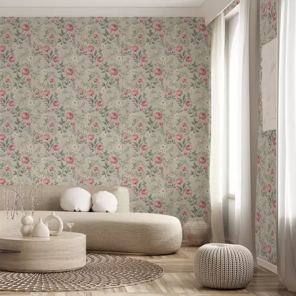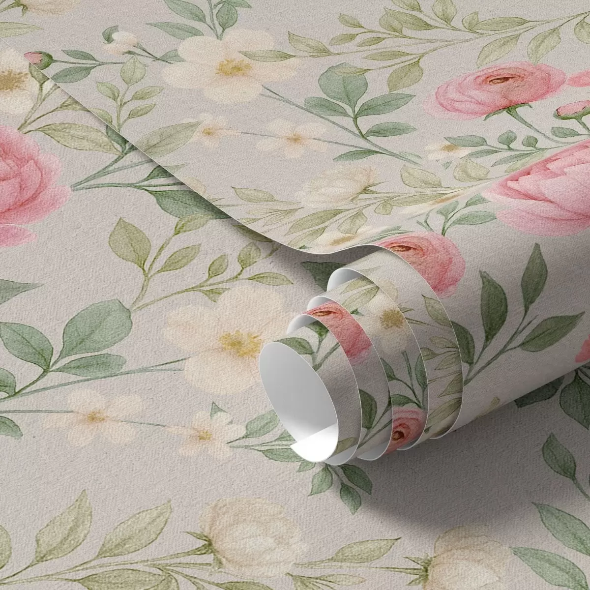 Papel de parede Peônias em aquarela e flores brancas sobre fundo cinza-bege a00592