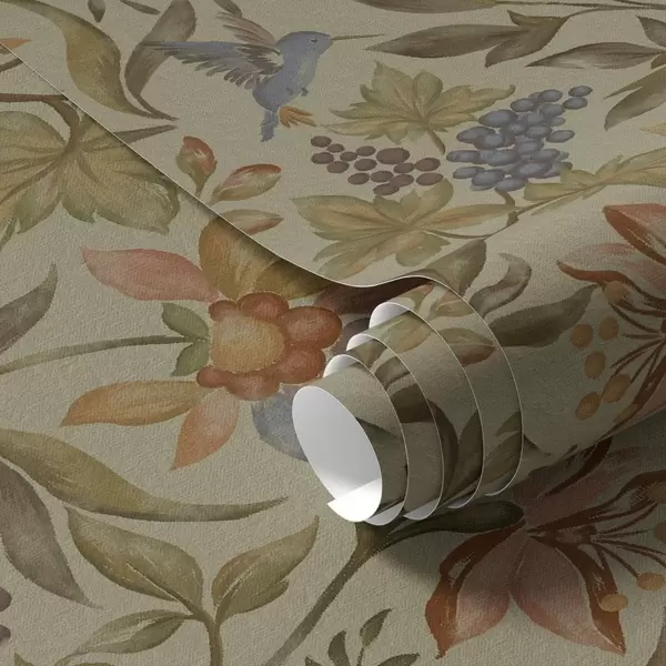 Papel de parede Flores e pássaros vintage com uvas sobre fundo verde-oliva a00594