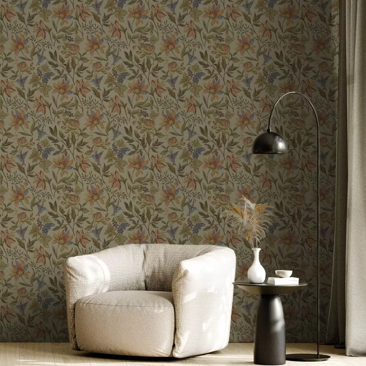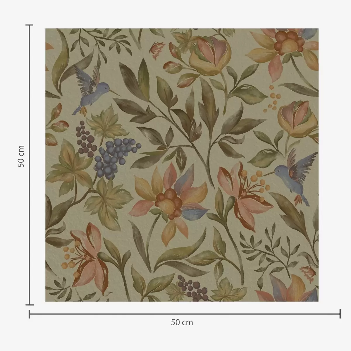 Papel de parede Flores e pássaros vintage com uvas sobre fundo verde-oliva Nr. a00594