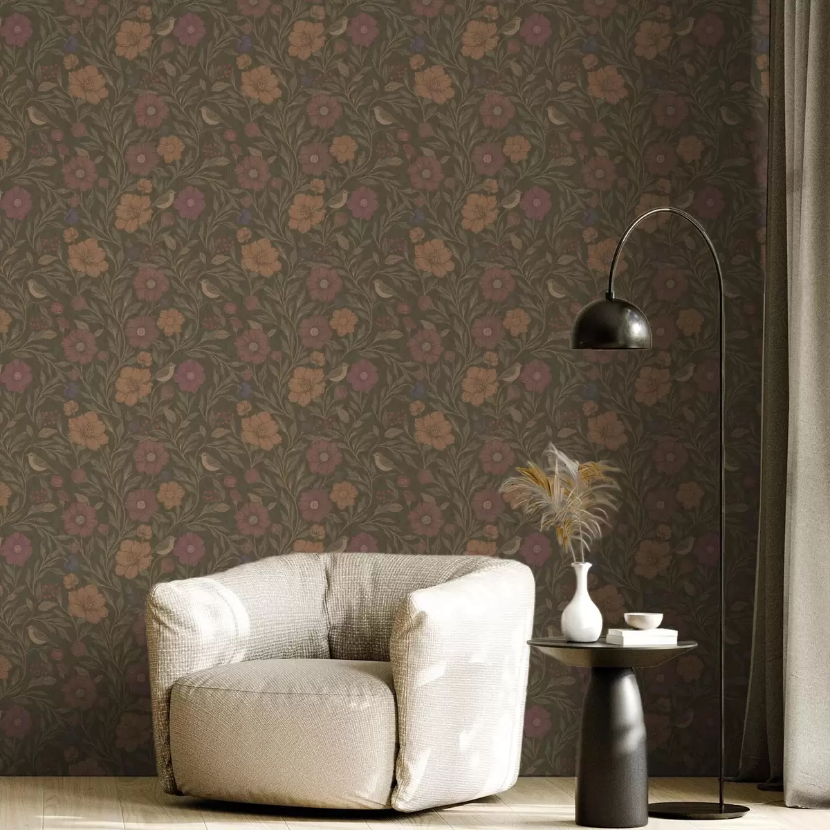 Papel de parede Flores e pássaros de outono sobre fundo marrom-oliva Nr. a00605
