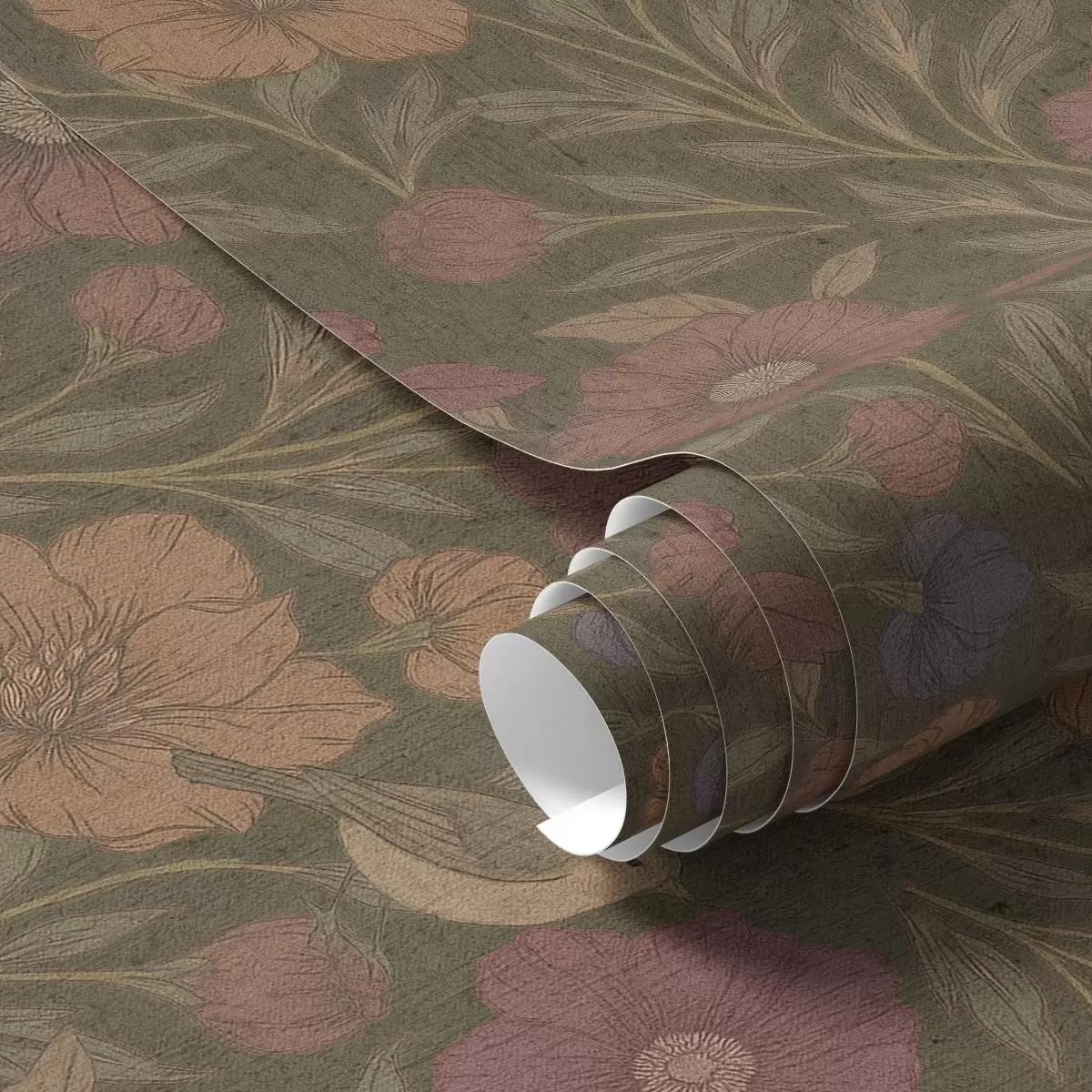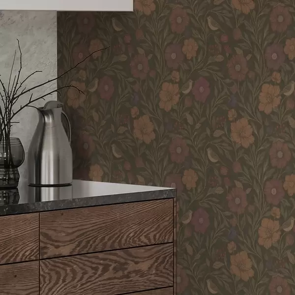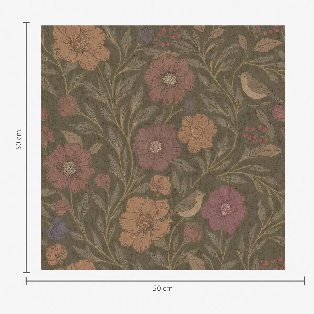 Papel de parede Flores e pássaros de outono sobre fundo marrom-oliva Nr. a00605