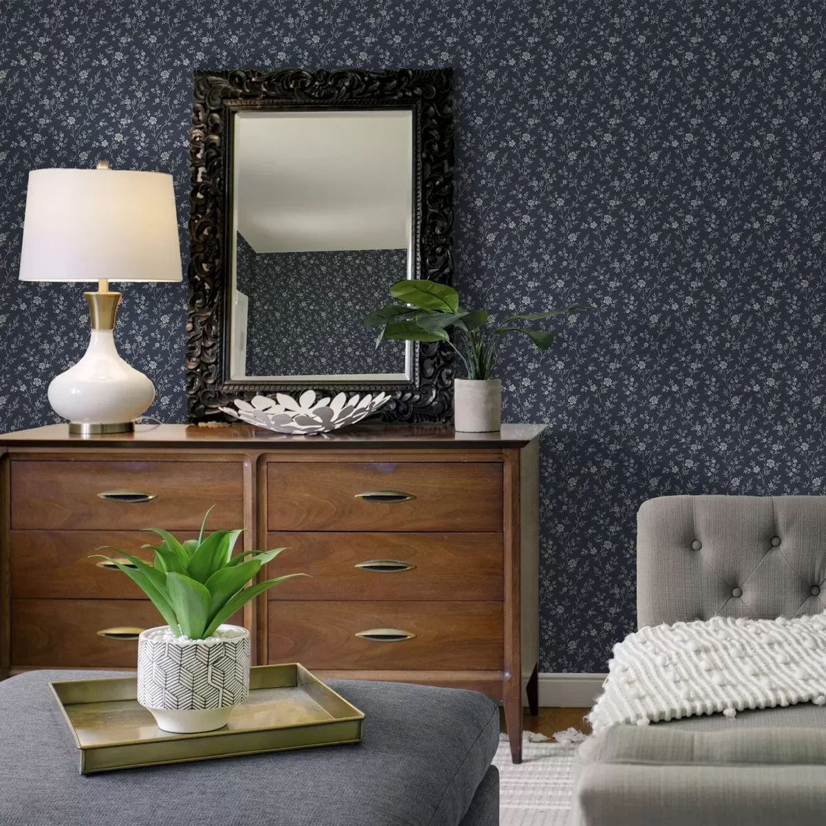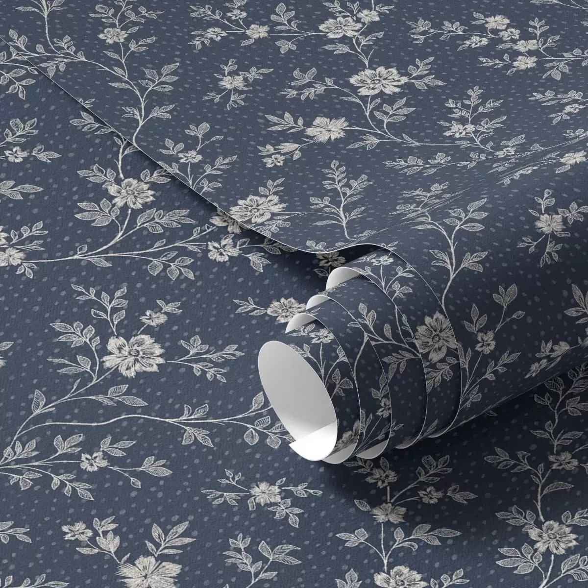 Papel de parede Fundo azul-marinho escuro com finos galhos e flores bege Nr. a00612