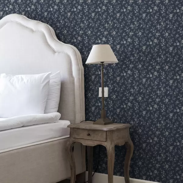 Papel de parede Fundo azul-marinho escuro com finos galhos e flores bege Nr. a00612