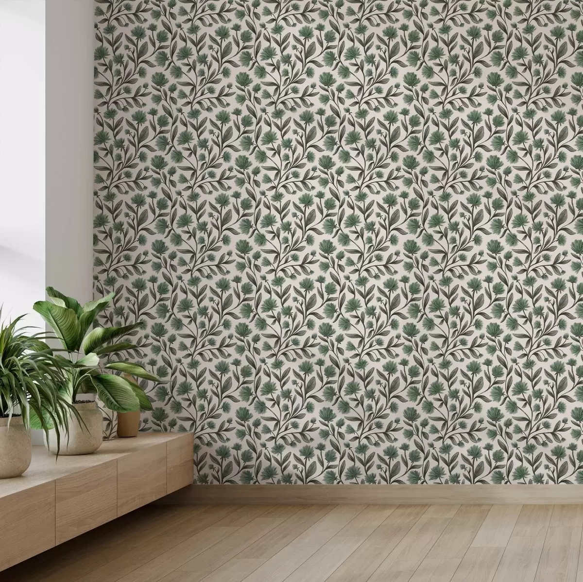 Papel de parede Flores silvestres em tons verdes sobre fundo creme Nr. a00623v3