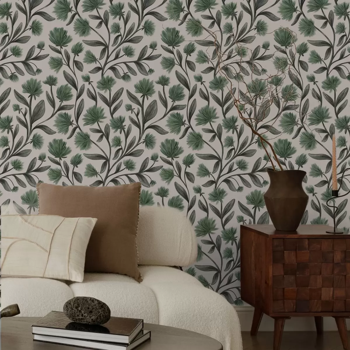 Papel de parede Flores silvestres em tons verdes sobre fundo creme a00623v3