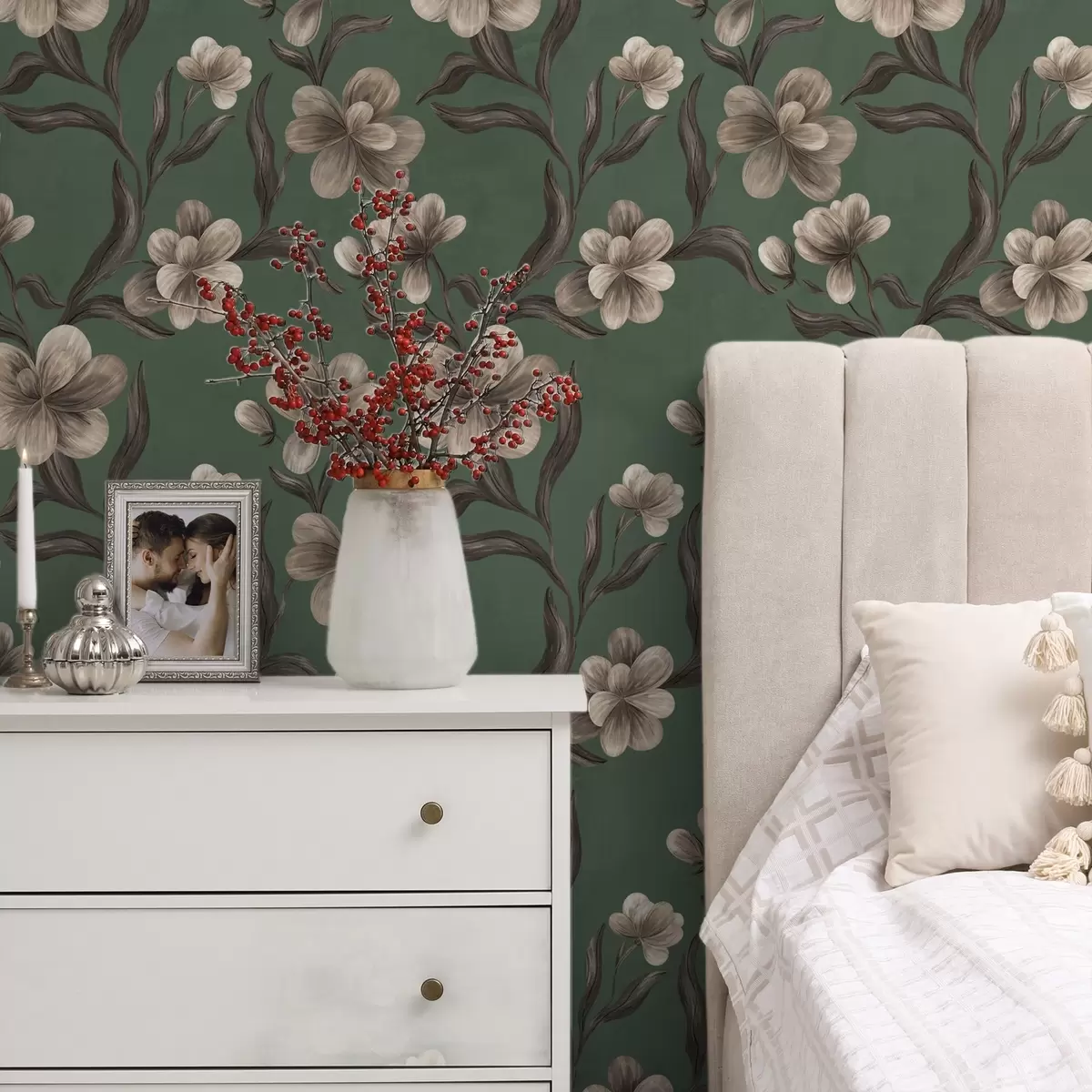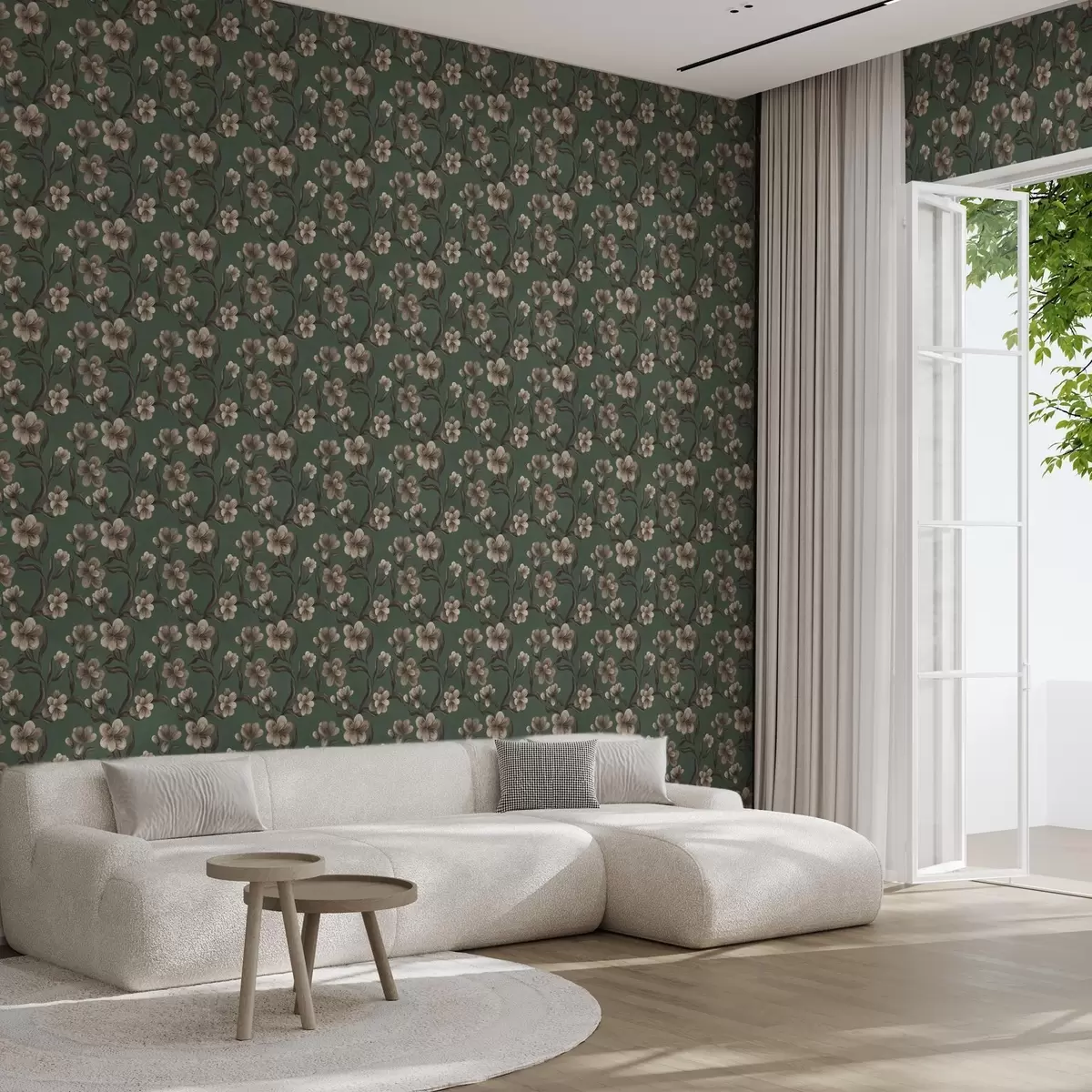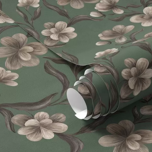 Papel de parede Flores bege sobre um fundo verde intenso Nr. a00626v3