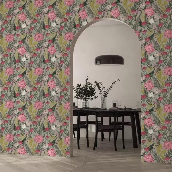 Papel de parede Flores exuberantes em tons de rosa e creme sobre fundo cinza, textura impasto Nr. a00629