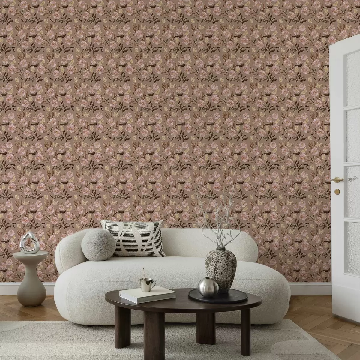 Papel de parede Flores cor-de-rosa e borboletas sobre um fundo castanho quente Nr. a00633v1