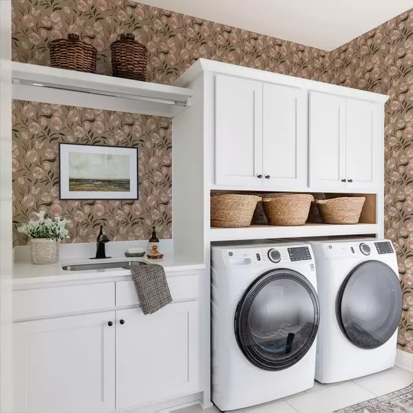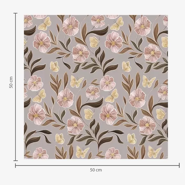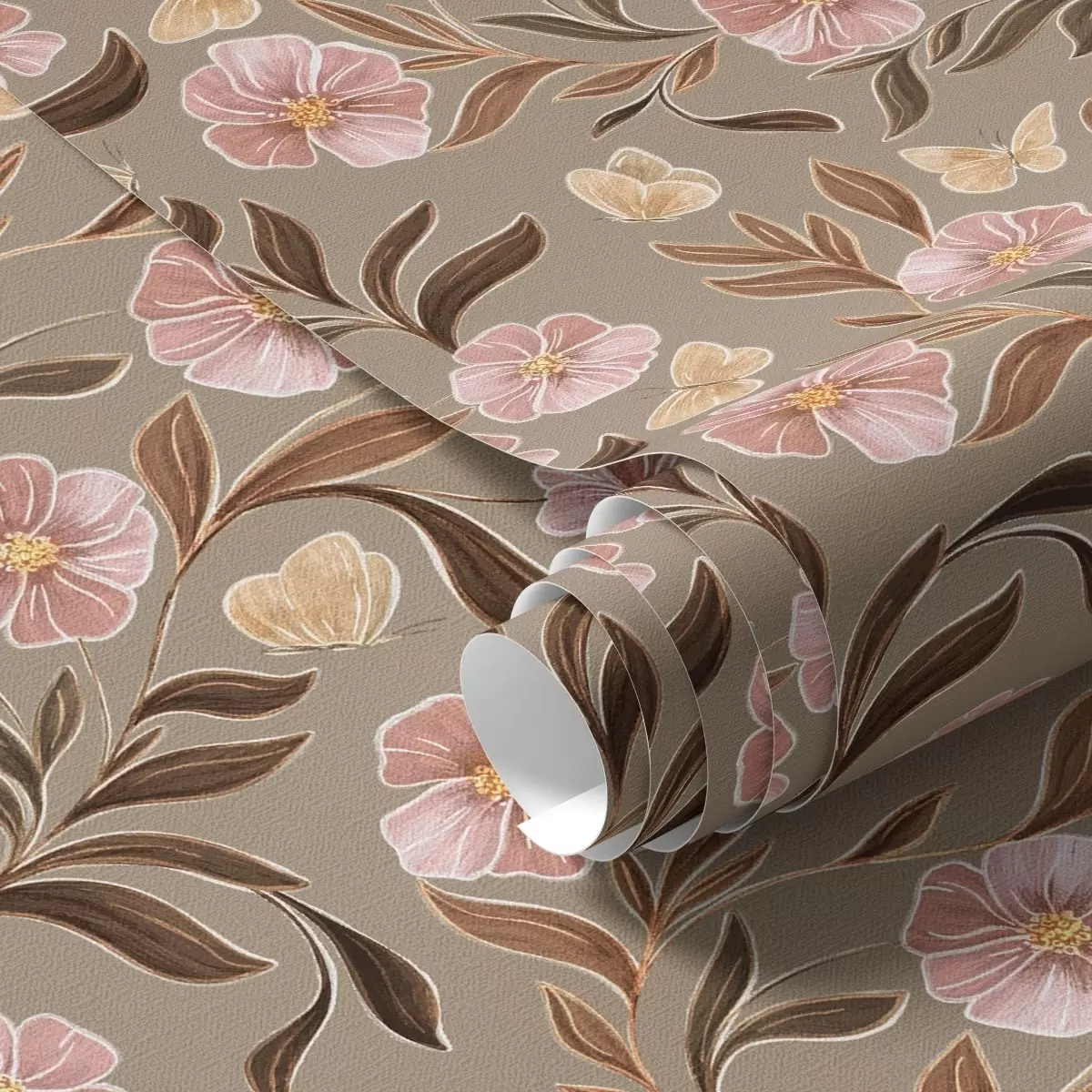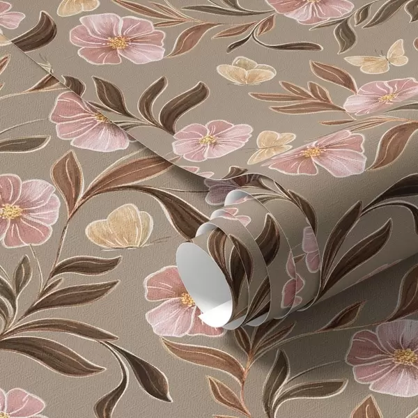 Papel de parede Flores cor-de-rosa e borboletas sobre um fundo bege-oliva Nr. a00633v2