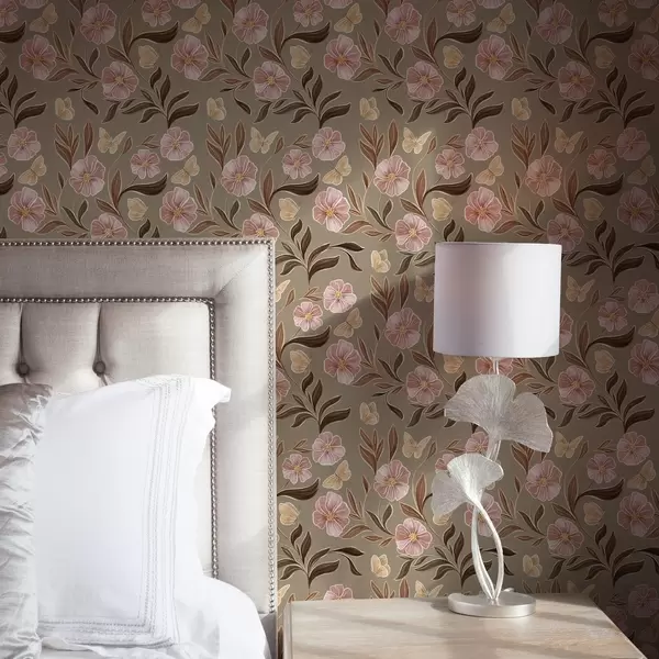 Papel de parede Flores cor-de-rosa e borboletas sobre um fundo bege-oliva Nr. a00633v2