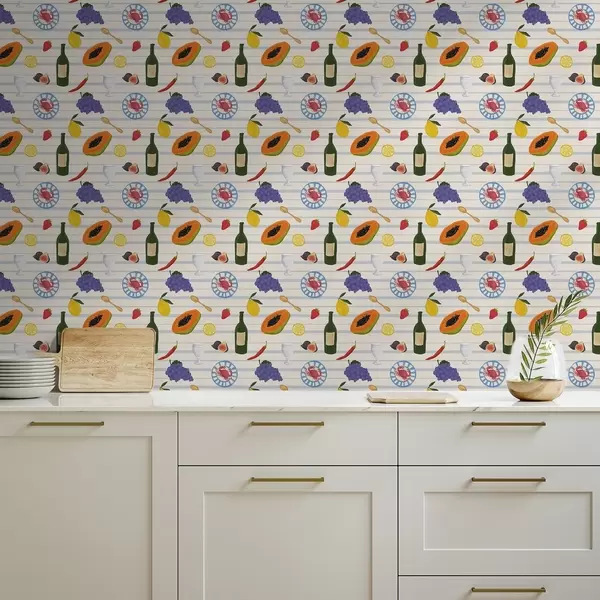 Papel de parede Impressão de cozinha com frutas, copos e pratos a00638