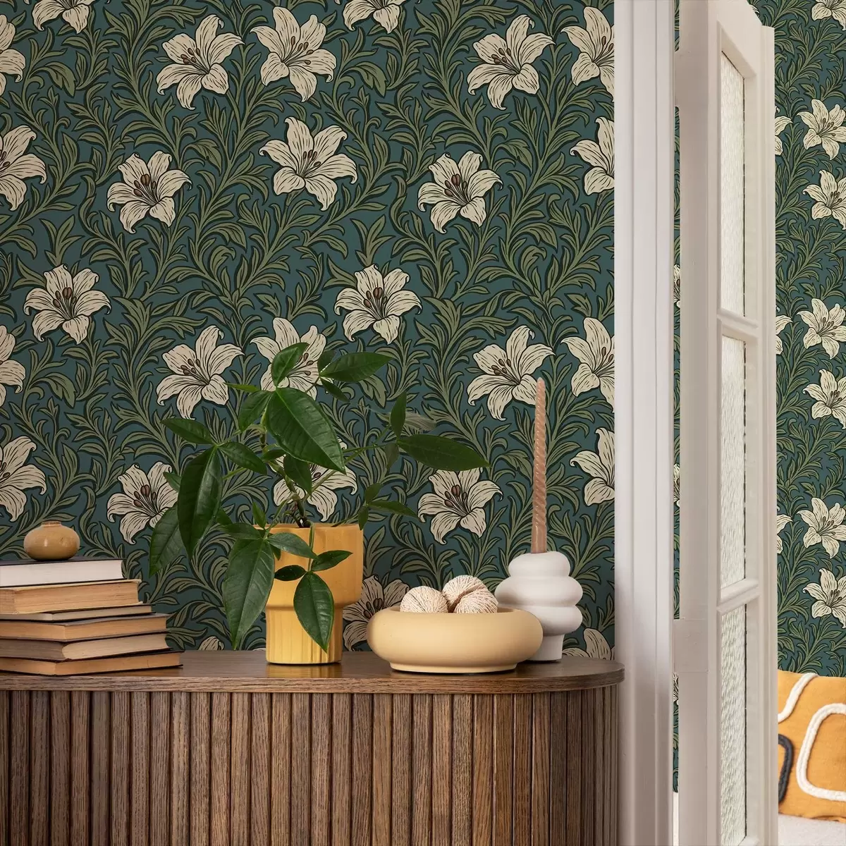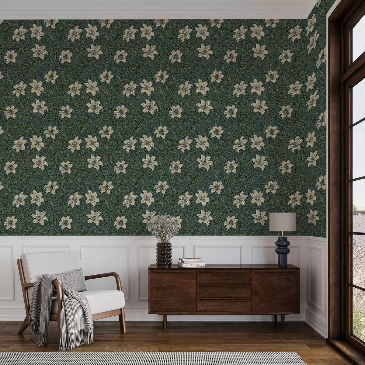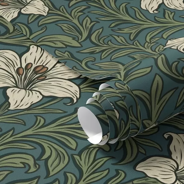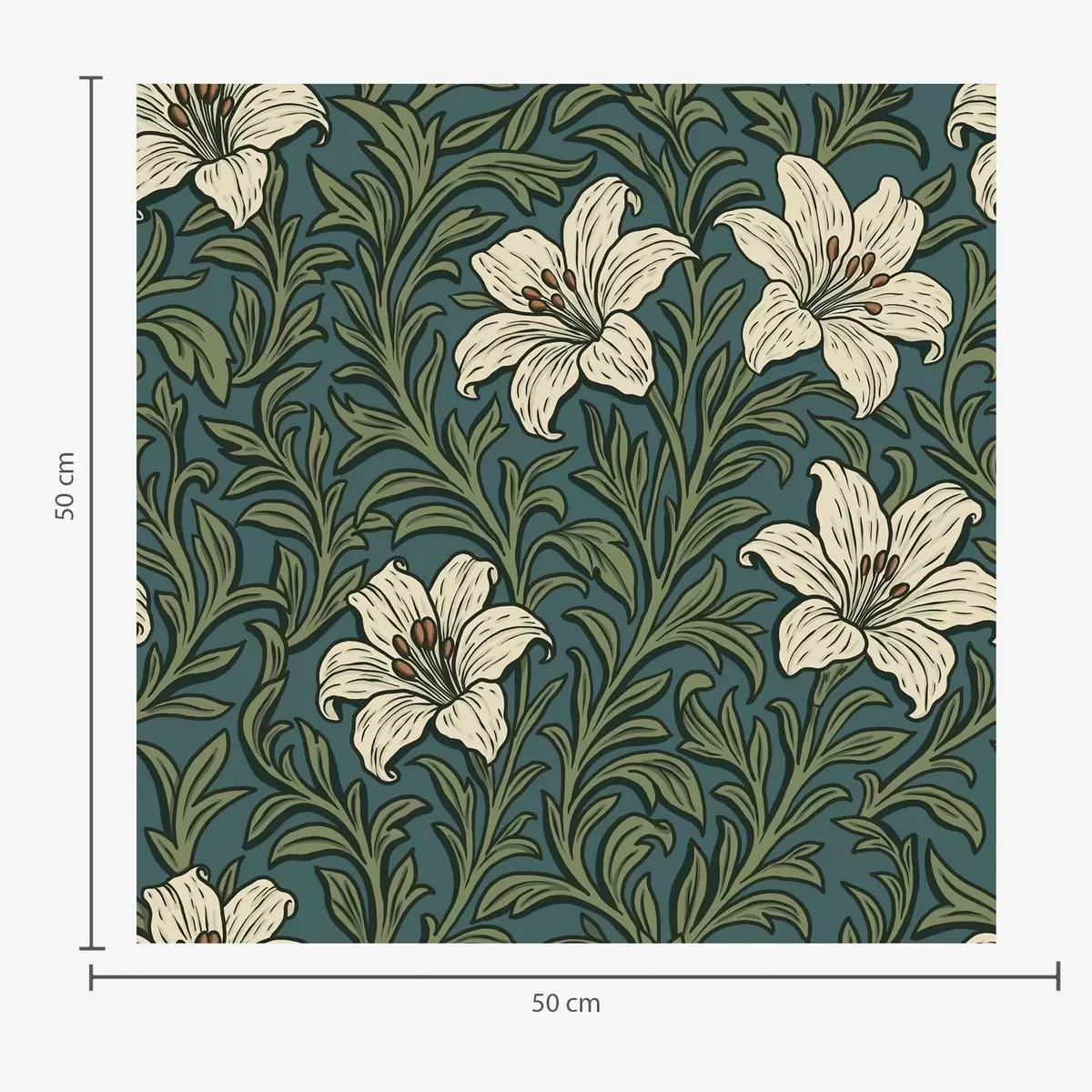Papel de parede Lírios creme entre uma vegetação densa sobre um fundo turquesa Nr. a00645